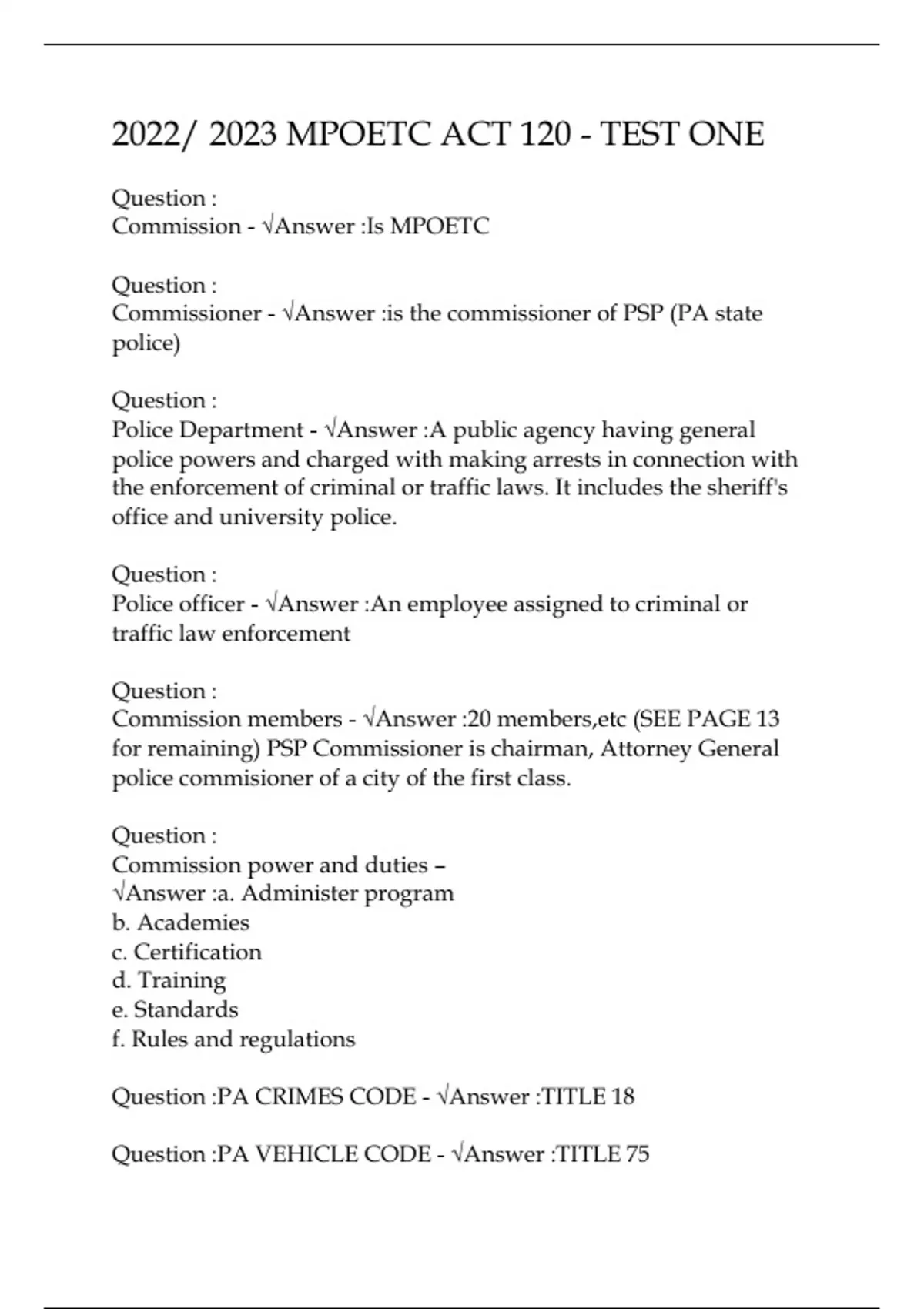 2022/ 2023 MPOETC ACT 120 - TEST ONE
