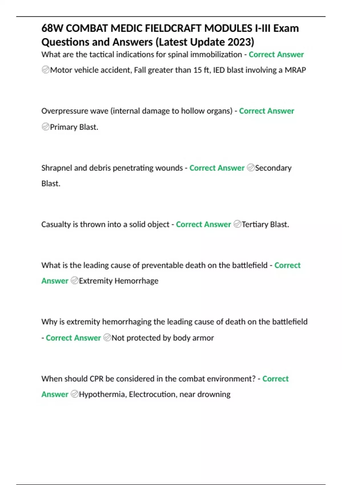 68W COMBAT MEDIC FIELDCRAFT MODULES I-III Exam Questions and Answers (Latest Update 2023).docx"