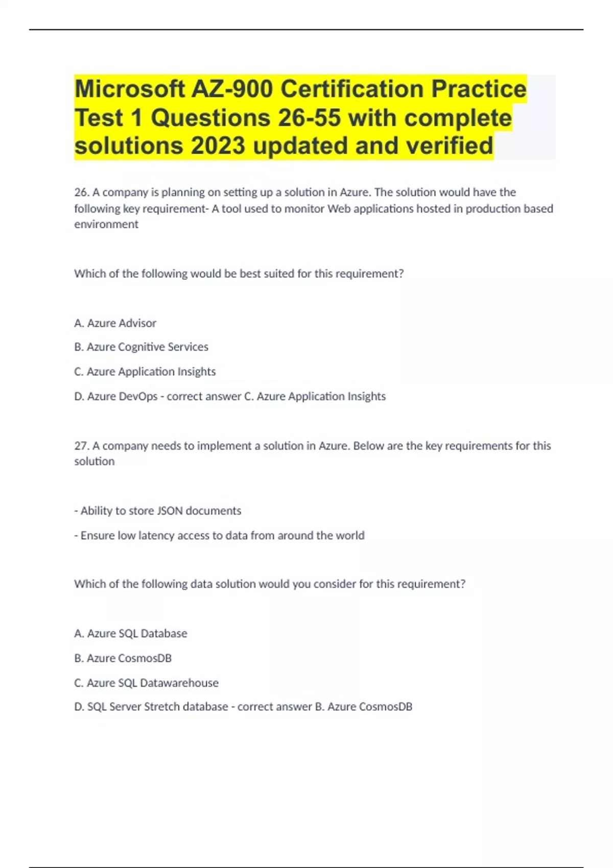 Microsoft AZ-900 Certification Practice Test 1 Questions 26-55 with complete solutions 2023 updated and verified