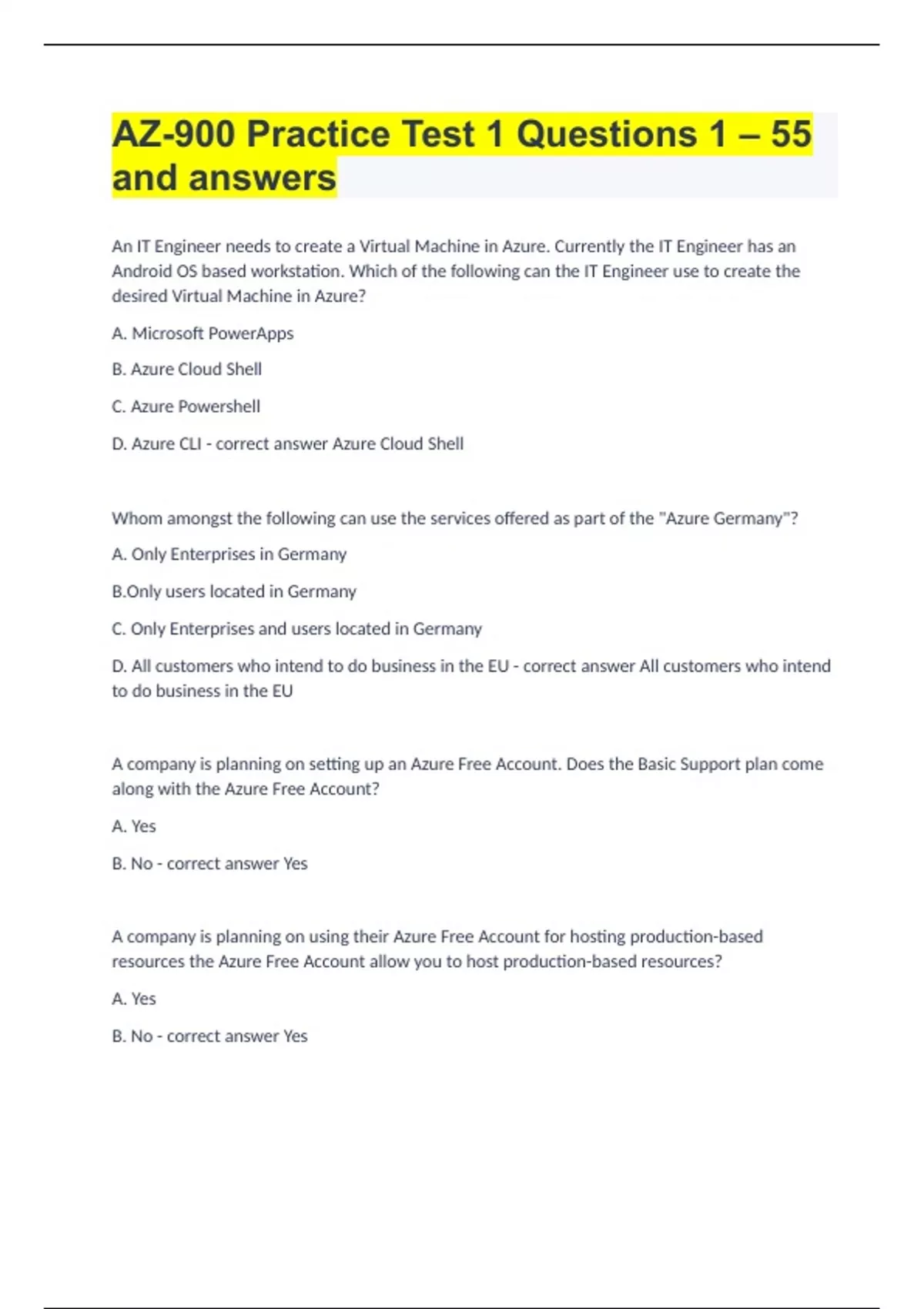 An IT Engineer needs to create a Virtual Machine in Azure. Currently the IT Engineer has an Android OS based workstation. Which of the following can the IT Engineer use to create the desired Virtual Machine in Azure? A. Microsoft PowerApps B. Azure Cloud Shell C. Azure Powershell D. Azure CLI Azure Cloud Shell Whom amongst the following can use the services offered as part of the "Azure Germany"? A. Only Enterprises in Germany B.Only users located in Germany C. Only Enterprises and users located in Germany D. All customers who intend to do business in the EU All customers who intend to do business in the EU A company is planning on setting up an Azure Free Account. Does the Basic Support plan come along with the Azure Free Account? A. Yes B. No Yes A company is planning on using their Azure Free Account for hosting production-based resources the Azure Free Account allow you to host production-based resources? A. Yes B. No Yes Your company is planning on using Azure AD for authentication to the resources defined in Azure. Does Azure AD have in-built capabilities for securing authentication and authorization to resources? A. Yes B. No Yes A company is planning on purchasing Azure AD Basic for their account. Does the Azure AD Basic tier come with an SLA of 99.9%? A. Yes B. No Yes A company is planning on upgrading their current Azure Free plan to the Azure AD Premium P1 plan. Does Microsoft provide the same feature set for both plans? A. Yes B. No No A company wants to try out some services which are being offered by Azure in Public Preview. Do the services in Public Preview in Azure come with an SLA? A. Yes B. No No A company wants to try out some services which are being offered by Azure in preview. Does Microsoft provide a separate Azure portal for trying out the services in preview? A. Yes B. No Yes Your company needs to deploy and manage several Azure Web apps using the Azure App service resource. Which of the following URL would you use to manage the Azure Web Apps? A. B. C. D. A company needs to store 2 TB of data that is infrequently used. The data needs to be accessed via Power BI. Which of the following could be used as a cost-effective data layer for the requirement? A. Azure SQL databases B. Azure PostgreSQL C. Azure Cosmos DB D. Azure Data Lake Azure Data Lake A company wants to ensure that users in their company are authenticated when they access resources defined in their Azure account. Which of the following is the correct definition of authentication? A. This specifies the type of service you can use in Azure B. This specifies the type of data you can use in Azure C. This is the act of providing legitimate credentials D. This specifies what you can do in Azure This is the act of providing legitimate credentials A company is planning on creating several Virtual Machines in Azure. Which of the following is the right category to which the Azure Virtual Machine belongs to? A. Infrastructure as a service (IaaS) B. Platform as a service (PaaS) C. Software as a service (SaaS) D. Function as a service (FaaS) Infrastructure as a service (IaaS) An IT Engineer needs to use Azure Cloud Shell. Which of the following icons would you use for this purpose? A. _ B. Bell icon C. Gear icon D. :) _ A company needs to create around 50 customized Virtual Machines. Out of these 20 are Windows based Virtual Machines and 30 are Ubuntu Machines. Which of the following would help reduce the administrative effort required to deploy the machines? A. Azure Load Balancer B. Azure Web Apps C. Azure Traffic Manager D. Azure ScaleSets Azure ScaleSets A company wants to make use of Azure for deployment of various solutions. They want to ensure that whenever users authenticate to Azure, they have to make use of Multi-Factor Authentication. Which of the following can help them achieve this? A. Azure AD Identity Protection B. Azure Security Centre C. Azure DDoS protection D. Azure privileged identity management Azure AD Identity Protection A company is planning on hosting 2 Virtual Machines in Azure as shown below. When the Virtual Machine demovm is stopped, will you still incur costs for the storage attached to the Virtual Machine? A. Yes B. No Yes Which of the following is true when it comes to SaaS (Software as a service)? A. You are responsible for scalability of the solution B. You are responsible for deploying the solution C. You are responsible for configuring the solution D. You are responsible for high availability of the solution You are responsible for configuring the solution A company is planning on setting up an Enterprise Azure Subscription. Do they need to have a valid Microsoft account for associating the Azure Subscription? A. Yes B. No Yes An IT administrator for a company has been given a powershell script. This powershell script will be used to create several Virtual Machine in Azure. You have to provide a machine to the IT administrator for running the powershell script. You decide to provide a Linux machine which has the Azure CLI tools installed. Would this solution fit the requirement? A. Yes B. No No An IT administrator for a company has been given a powershell script. This powershell script will be used to create several Virtual Machine in Azure. You have to provide a machine to the IT administrator for running the powershell script. You decide to provide a ChromeOS based machine and use Azure Cloud Shell. Would this solution fit the requirement? A. Yes B. No Yes An IT administrator for a company has been given a powershell script. This powershell script will be used to create several Virtual Machine in Azure. You have to provide a machine to the IT administrator for running the powershell script. You decide to provide a computer that has MacOS and Powershell Core 6.0 installed. Would this solution fit the requirement? A. Yes B. No Yes A company is planning on setting up a solution in Azure. The solution would have the following key requirement -An integration solution for the deploym