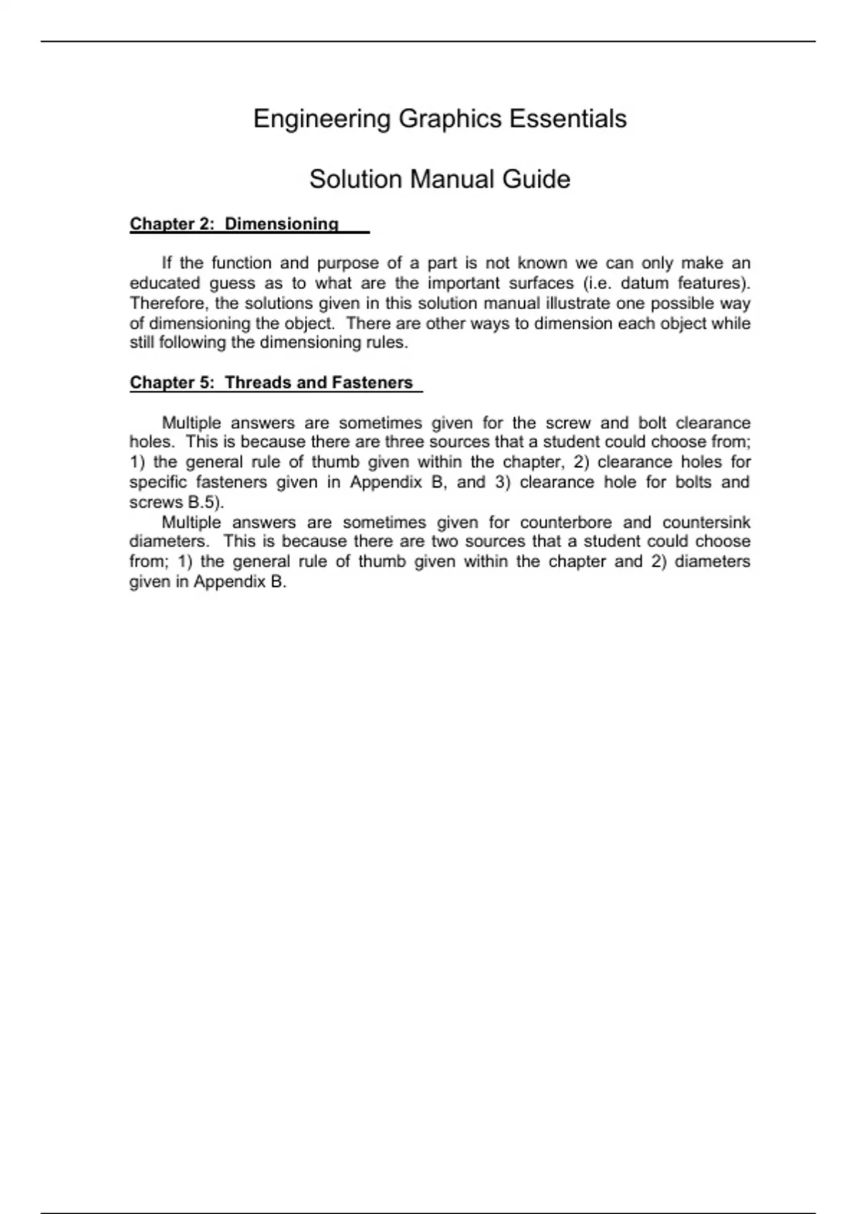 Chapter : Dimensioning If the function and purpose of a part is not known we can only make an educated guess as to what are the important surfaces (i.e. datum features). Therefore, the solutions given in this solution manual illustrate one possible way of dimensioning the object. There are other ways to dimension each object while still following the dimensioning rules. Chapter : Threads and Fasteners Multiple answers are sometimes given for the screw and bolt clearance holes. This is because there are three sources that a student could choose from; 1) the general rule of thumb given within the chapter, 2) clearance holes for specific fasteners given in Appendix B, and 3) clearance hole for bolts and screws B.5). Multiple answers are sometimes given for counterbore and countersink diameters. This is because there are two sources that a student could choose from; 1) the general rule of thumb given within the chapter and 2) diameters given in Appendix B.