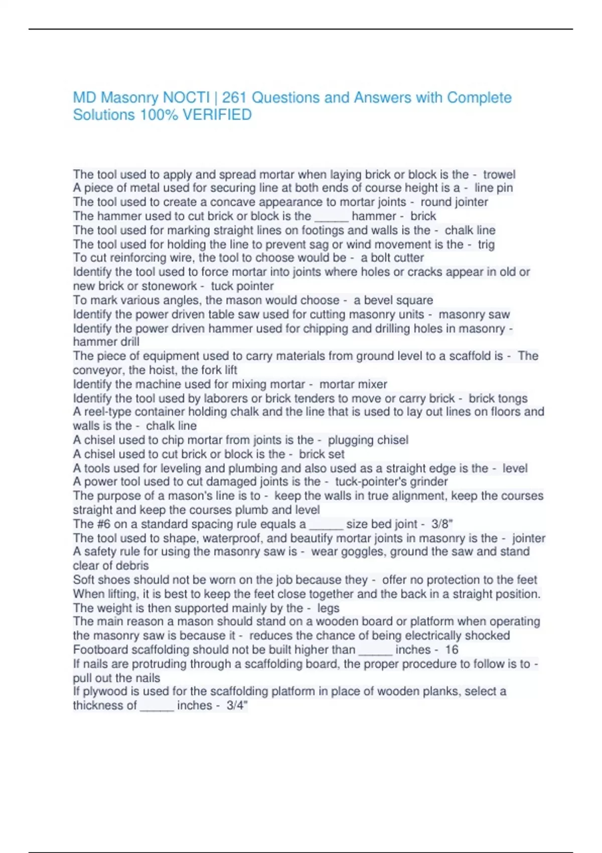 MD Masonry NOCTI | 261 Questions and Answers with Complete Solutions 100% VERIFIED The tool used to apply and spread mortar when laying brick or block is the - trowel A piece of metal used for securing line at both ends of course height is a - line pin The tool used to create a concave appearance to mortar joints - round jointer The hammer used to cut brick or block is the _____ hammer - brick The tool used for marking straight lines on footings and walls is the - chalk line The tool used for holding the line to prevent sag or wind movement is the - trig To cut reinforcing wire, the tool to choose would be - a bolt cutter Identify the tool used to force mortar into joints where holes or cracks appear in old or new brick or stonework - tuck pointer To mark various angles, the mason would choose - a bevel square Identify the power driven table saw used for cutting masonry units - masonry saw Identify the power driven hammer used for chipping and drilling holes in masonry - hammer drill The piece of equipment used to carry materials from ground level to a scaffold is - The conveyor, the hoist, the fork lift Identify the machine used for mixing mortar - mortar mixer Identify the tool used by laborers or brick tenders to move or carry brick - brick tongs A reel-type container holding chalk and the line that is used to lay out lines on floors and walls is the - chalk line A chisel used to chip mortar from joints is the - plugging chisel A chisel used to cut brick or block is the - brick set A tools used for leveling and plumbing and also used as a straight edge is the - level A power tool used to cut damaged joints is the - tuck-pointer's grinder The purpose of a mason's line is to - keep the walls in true alignment, keep the courses straight and keep the courses plumb and level The #6 on a standard spacing rule equals a _____ size bed joint - 3/8" The tool used to shape, waterproof, and beautify mortar joints in masonry is the - jointer A safety rule for using the masonry saw is - wear goggles, ground the saw and stand clear of debris Soft shoes should not be worn on the job because they - offer no protection to the feet When lifting, it is best to keep the feet close together and the back in a straight position. The weight is then supported mainly by the - legs The main reason a mason should stand on a wooden board or platform when operating the masonry saw is because it - reduces the chance of being electrically shocked Footboard scaffolding should not be built higher than _____ inches - 16 If nails are protruding through a scaffolding board, the proper procedure to follow is to - pull out the nails If plywood is used for the scaffolding platform in place of wooden planks, select a thickness of _____ inches - 3/4" To prevent the planks from slipping off the brackets on the ends of scaffolding, they should be - cleated on the bottom To provide the best load distribution of materials on the scaffolding, materials should be stacked - over the frames What should be applied to skin burns - cold water What conditions should not exist in a hardhat - metal shell, shell used without suspension, holes drilled in shell to cool the head What attribute of safety shoes prevents injury to the foot - height above the ankle, durable material, reinforced toe Safety glasses are necessary to protect against - dust and chips Respirators are used to protect the - lungs To be effective, the respirator must - fit snugly against the face, cover the mouth and nose, be fitted with the correct filter Openings in decks and edges of buildings need - to be guarded by protective railings Ladders should extend _____ above a landing - 2' The federal agency in charge of safety standards - OSHA A well-mixed combination of Portland cement and lime is called - masonry cement Mortar's ability to withstand wear, abrasion, and weathering is referred to as - durability A mixture of burned clay and limestone finely ground for making concrete or mortar is - Portland cement For what two properties should mortar sand be tested - cleanness and grade Identify the combination of cement, lime, sand and water - mortar Blocks of stone cut to specified dimensions are called _____ stone - cut Artificial stone, generally made with concrete is called - cast stone The unit placed over an opening in a wall is a - lintel A unit with nominal dimensions based on 4" is called - a modular Materials made of clays that will resist high temperatures are called - refractory units What is the masonry unit immediately under an opening such as a window or door - sill Masonry construction fabricated in a location other than the job site is called a - prefabricated unit The condition of mortar that is easily handled with a trowel is called - workability Softening mortar by adding water and mixing is called - tempering When batches of mortar are the same mixture and wetness they are said to be the same - consistency The thin mortar-like material that is poured into walls for reinforcement is called - grout The method of picking up mortar and brick at the same time is the _____ method - pick and dip Identify the process of placing the mortar on the course that has been laid - spreading mortar The piece of wood that has been marked for couse levels, sills, door and window heads and story heights is the - story pole Vertical mortar joints between ends of masonry units, also called cross-joints, are - head joints The tool used to establish corners with courses marked and line attached (deadman) is the - corner pole The horizontal layer of mortar on which a masonry unit is laid is - a bed joint The line used to keep masonry units on true alignment form corner to corner is the _____ line - mason's Identify the method of stepping back successive courses of masonry - racking back The section of wall built in advance of the rest of the wall to determine wall lines and elevation is referred to as - the lead Identify the method of bonding or tying together the outer and in
