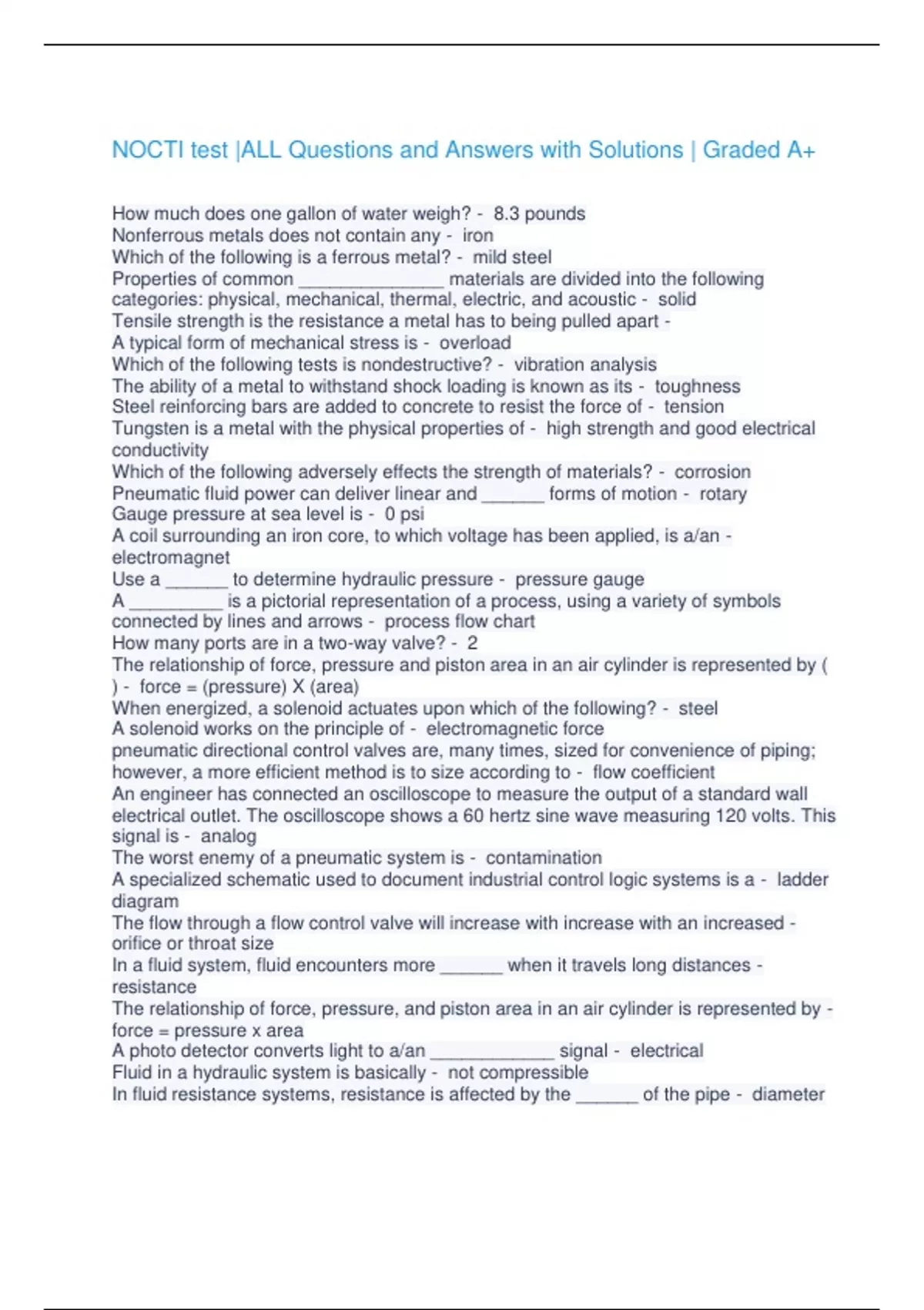 NOCTI test |ALL Questions and Answers with Solutions | Graded A+ How much does one gallon of water weigh? - 8.3 pounds Nonferrous metals does not contain any - iron Which of the following is a ferrous metal? - mild steel Properties of common ______________ materials are divided into the following categories: physical, mechanical, thermal, electric, and acoustic - solid Tensile strength is the resistance a metal has to being pulled apart - A typical form of mechanical stress is - overload Which of the following tests is nondestructive? - vibration analysis The ability of a metal to withstand shock loading is known as its - toughness Steel reinforcing bars are added to concrete to resist the force of - tension Tungsten is a metal with the physical properties of - high strength and good electrical conductivity Which of the following adversely effects the strength of materials? - corrosion Pneumatic fluid power can deliver linear and ______ forms of motion - rotary Gauge pressure at sea level is - 0 psi A coil surrounding an iron core, to which voltage has been applied, is a/an - electromagnet Use a ______ to determine hydraulic pressure - pressure gauge A _________ is a pictorial representation of a process, using a variety of symbols connected by lines and arrows - process flow chart How many ports are in a two-way valve? - 2 The relationship of force, pressure and piston area in an air cylinder is represented by ( ) - force = (pressure) X (area) When energized, a solenoid actuates upon which of the following? - steel A solenoid works on the principle of - electromagnetic force pneumatic directional control valves are, many times, sized for convenience of piping; however, a more efficient method is to size according to - flow coefficient An engineer has connected an oscilloscope to measure the output of a standard wall electrical outlet. The oscilloscope shows a 60 hertz sine wave measuring 120 volts. This signal is - analog The worst enemy of a pneumatic system is - contamination A specialized schematic used to document industrial control logic systems is a - ladder diagram The flow through a flow control valve will increase with increase with an increased - orifice or throat size In a fluid system, fluid encounters more ______ when it travels long distances - resistance The relationship of force, pressure, and piston area in an air cylinder is represented by - force = pressure x area A photo detector converts light to a/an ____________ signal - electrical Fluid in a hydraulic system is basically - not compressible In fluid resistance systems, resistance is affected by the ______ of the pipe - diameter To determine pressure in a hydraulic system, ________ the total force by the area on which it acts - divide The purpose of a hydraulic system is to - transform mechanical energy into hydraulic energy Atmospheric pressure at sea level is - 14.7 psi Increasing a flowing liquids viscosity or friction, or changing flow direction, will result in - velocity increase The formula for force of a hydraulic cylinder is (4 words) - pressure multiplied by area If containments block a system, the first place the blockage occurs is in - the suction side of a systems pump The speed of a pneumatic cylinder is affected mainly by - compressibility of air A network interface card (NIC) on a computer is receiving a series of pulses measuring +5 volts DC then alternating back to 0 volts. The +5 volt signal is referred to as - high Compared with hydraulic systems, pneumatic systems provide inexpensive material, faster operation and - a non-hazardous medium A photo diode - emits light when a current passes through it The relationship be