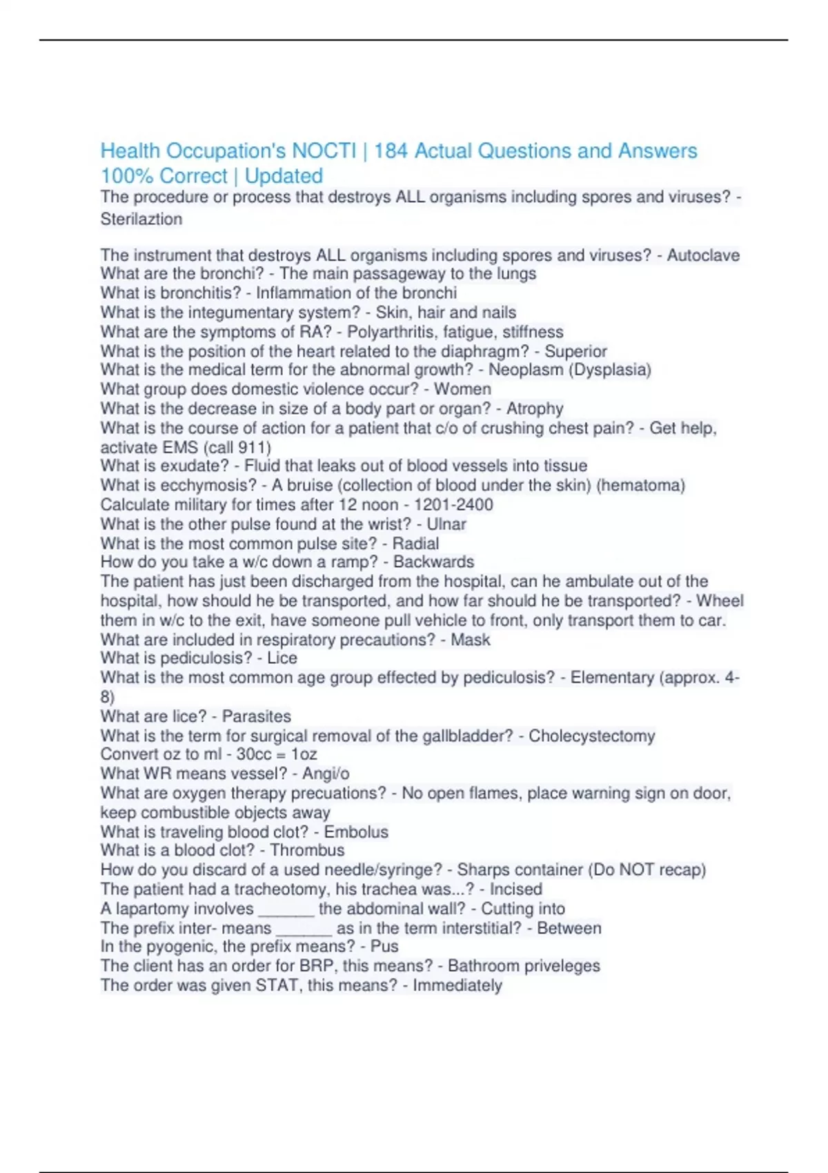 Health Occupation's NOCTI | 184 Actual Questions and Answers 100% Correct | Updated The procedure or process that destroys ALL organisms including spores and viruses? - Sterilaztion The instrument that destroys ALL organisms including spores and viruses? - Autoclave What are the bronchi? - The main passageway to the lungs What is bronchitis? - Inflammation of the bronchi What is the integumentary system? - Skin, hair and nails What are the symptoms of RA? - Polyarthritis, fatigue, stiffness What is the position of the heart related to the diaphragm? - Superior What is the medical term for the abnormal growth? - Neoplasm (Dysplasia) What group does domestic violence occur? - Women What is the decrease in size of a body part or organ? - Atrophy What is the course of action for a patient that c/o of crushing chest pain? - Get help, activate EMS (call 911) What is exudate? - Fluid that leaks out of blood vessels into tissue What is ecchymosis? - A bruise (collection of blood under the skin) (hematoma) Calculate military for times after 12 noon - What is the other pulse found at the wrist? - Ulnar What is the most common pulse site? - Radial How do you take a w/c down a ramp? - Backwards The patient has just been discharged from the hospital, can he ambulate out of the hospital, how should he be transported, and how far should he be transported? - Wheel them in w/c to the exit, have someone pull vehicle to front, only transport them to car. What are included in respiratory precautions? - Mask What is pediculosis? - Lice What is the most common age group effected by pediculosis? - Elementary (approx. 4-8) What are lice? - Parasites What is the term for surgical removal of the gallbladder? - Cholecystectomy Convert oz to ml - 30cc = 1oz What WR means vessel? - Angi/o What are oxygen therapy precuations? - No open flames, place warning sign on door, keep combustible objects away What is traveling blood clot? - Embolus What is a blood clot? - Thrombus How do you discard of a used needle/syringe? - Sharps container (Do NOT recap) The patient had a tracheotomy, his trachea was...? - Incised A lapartomy involves ______ the abdominal wall? - Cutting into The prefix inter- means ______ as in the term interstitial? - Between In the pyogenic, the prefix means? - Pus The client has an order for BRP, this means? - Bathroom priveleges The order was given STAT, this means? - Immediately The muscle was atrophied. Atrophy means? - Waste away (due to poor nutrition) The resident c/o dysuria. This means? - Painful urination After colorectal surgery, the patient awoke with a stoma. He had? - An artificial opening The thoracic cavity is situated how? - Anterior The heart & lungs are contained in the ______ cavity? - Thoracic The stomach is ______ to the pancreas? - Superior The client Fx his tibia. He was referred to? - Orthopedist The client suffered from Morton's nueroma on the right foot which required surgery. He was referred to a(n)? - Podiatrist