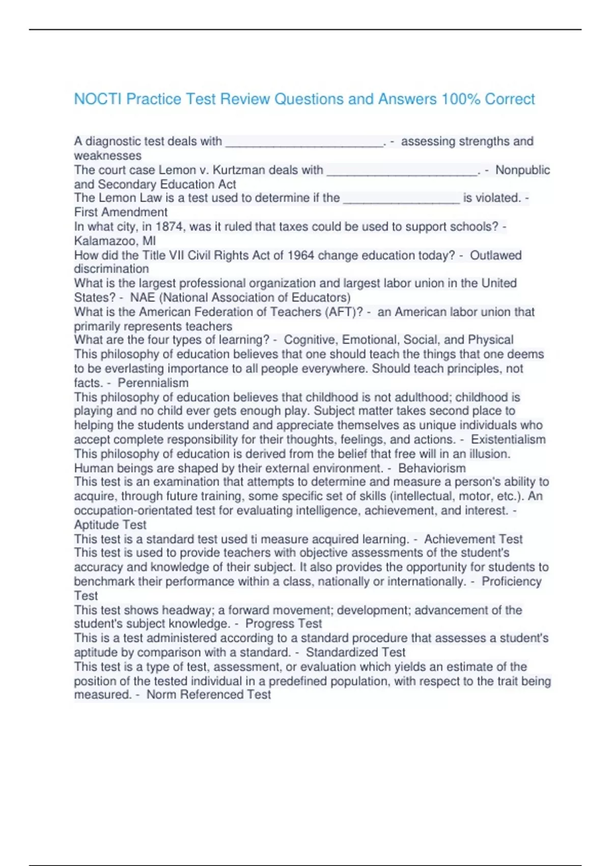 NOCTI Practice Test Review Questions and Answers 100% Correct A diagnostic test deals with _______________________. - assessing strengths and weaknesses The court case Lemon v. Kurtzman deals with ______________________. - Nonpublic and Secondary Education Act The Lemon Law is a test used to determine if the _________________ is violated. - First Amendment In what city, in 1874, was it ruled that taxes could be used to support schools? - Kalamazoo, MI How did the Title VII Civil Rights Act of 1964 change education today? - Outlawed discrimination What is the largest professional organization and largest labor union in the United States? - NAE (National Association of Educators) What is the American Federation of Teachers (AFT)? - an American labor union that primarily represents teachers What are the four types of learning? - Cognitive, Emotional, Social, and Physical This philosophy of education believes that one should teach the things that one deems to be everlasting importance to all people everywhere. Should teach principles, not facts. - Perennialism This philosophy of education believes that childhood is not adulthood; childhood is playing and no child ever gets enough play. Subject matter takes second place to helping the students understand and appreciate themselves as unique individuals who accept complete responsibility for their thoughts, feelings, and actions. - Existentialism This philosophy of education is derived from the belief that free will in an illusion. Human beings are shaped by their external environment. - Behaviorism This test is an examination that attempts to determine and measure a person's ability to acquire, through future training, some specific set of skills (intellectual, motor, etc.). An occupation-orientated test for evaluating intelligence, achievement, and interest. - Aptitude Test This test is a standard test used ti measure acquired learning. - Achievement Test This test is used to provide teachers with objective assessments of the student's accuracy and knowledge of their subject. It also provides the opportunity for students to benchmark their performance within a class, nationally or internationally. - Proficiency Test This test shows headway; a forward movement; development; advancement of the student's subject knowledge. - Progress Test This is a test administered according to a standard procedure that assesses a student's aptitude by comparison with a standard. - Standardized Test This test is a type of test, assessment, or evaluation which yields an estimate of the position of the tested individual in a predefined population, with respect to the trait being measured. - Norm Referenced Test This test is one that provides for translating test scores into a statement about the behav