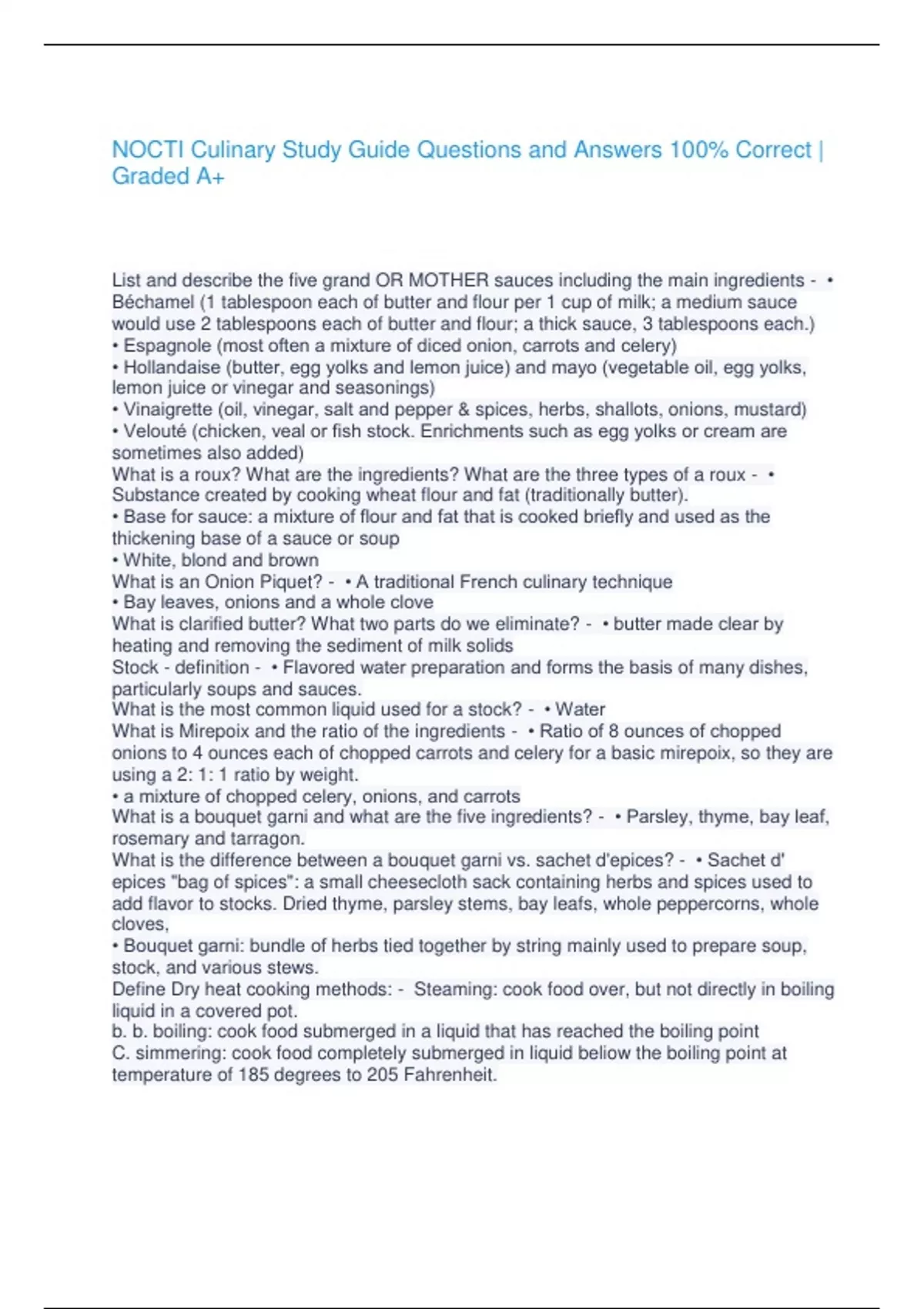 List and describe the five grand OR MOTHER sauces including the main ingredients - • Béchamel (1 tablespoon each of butter and flour per 1 cup of milk; a medium sauce would use 2 tablespoons each of butter and flour; a thick sauce, 3 tablespoons each.) • Espagnole (most often a mixture of diced onion, carrots and celery) • Hollandaise (butter, egg yolks and lemon juice) and mayo (vegetable oil, egg yolks, lemon juice or vinegar and seasonings) • Vinaigrette (oil, vinegar, salt and pepper & spices, herbs, shallots, onions, mustard) • Velouté (chicken, veal or fish stock. Enrichments such as egg yolks or cream are sometimes also added) What is a roux? What are the ingredients? What are the three types of a roux - • Substance created by cooking wheat flour and fat (traditionally butter). • Base for sauce: a mixture of flour and fat that is cooked briefly and used as the thickening base of a sauce or soup • White, blond and brown What is an Onion Piquet? - • A traditional French culinary technique • Bay leaves, onions and a whole clove What is clarified butter? What two parts do we eliminate? - • butter made clear by heating and removing the sediment of milk solids Stock - definition - • Flavored water preparation and forms the basis of many dishes, particularly soups and sauces. What is the most common liquid used for a stock? - • Water What is Mirepoix and the ratio of the ingredients - • Ratio of 8 ounces of chopped onions to 4 ounces each of chopped carrots and celery for a basic mirepoix, so they are using a 2: 1: 1 ratio by weight. • a mixture of chopped celery, onions, and carrots What is a bouquet garni and what are the five ingredients? - • Parsley, thyme, bay leaf, rosemary and tarragon. What is the difference between a bouquet garni vs. sachet d'epices? - • Sachet d' epices "bag of spices": a small cheesecloth sack containing herbs and spices used to add flavor to stocks. Dried thyme, parsley stems, bay leafs, whole peppercorns, whole cloves, • Bouquet garni: bundle of herbs tied together by string mainly used to prepare soup, stock, and various stews. Define Dry heat cooking methods: - Steaming: cook food over, but not directly in boiling liquid in a covered pot. b. b. boiling: cook food submerged in a liquid that has reached the boiling point C. simmering: cook food completely submerged in liquid beliow the boiling point at