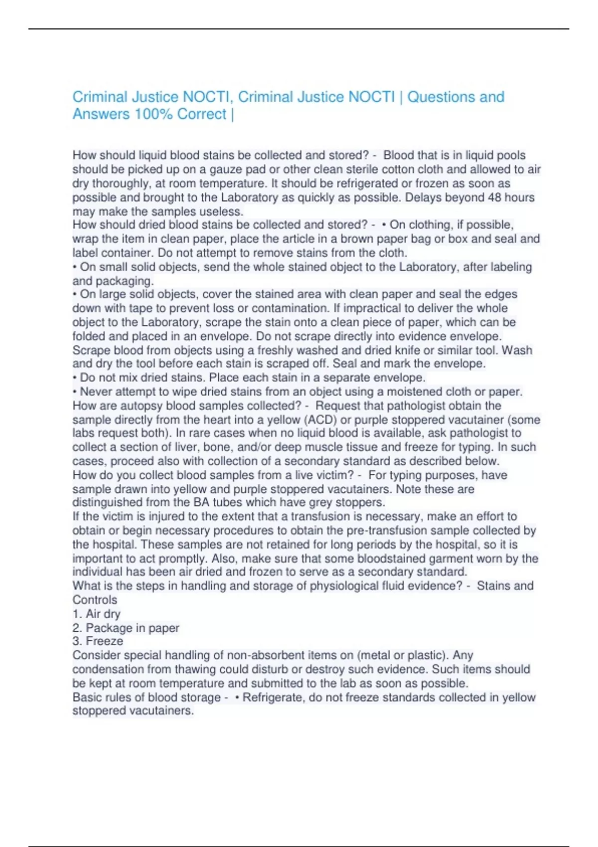 Criminal Justice NOCTI, Criminal Justice NOCTI | Questions and Answers 100% Correct | How should liquid blood stains be collected and stored? - Blood that is in liquid pools should be picked up on a gauze pad or other clean sterile cotton cloth and allowed to air dry thoroughly, at room temperature. It should be refrigerated or frozen as soon as possible and brought to the Laboratory as quickly as possible. Delays beyond 48 hours may make the samples useless. How should dried blood stains be collected and stored? - • On clothing, if possible, wrap the item in clean paper, place the article in a brown paper bag or box and seal and label container. Do not attempt to remove stains from the cloth. • On small solid objects, send the whole stained object to the Laboratory, after labeling and packaging. • On large solid objects, cover the stained area with clean paper and seal the edges down with tape to prevent loss or contamination. If impractical to deliver the whole object to the Laboratory, scrape the stain onto a clean piece of paper, which can be folded and placed in an envelope. Do not scrape directly into evidence envelope. Scrape blood from objects using a freshly washed and dried knife or similar tool. Wash and dry the tool before each stain is scraped off. Seal and mark the envelope. • Do not mix dried stains. Place each stain in a separate envelope. • Never attempt to wipe dried stains from an object using a moistened cloth or paper. How are autopsy blood samples collected? - Request that pathologist obtain the sample directly from the heart into a yellow (ACD) or purple stoppered vacutainer (some labs request both). In rare cases when no liquid blood is available, ask pathologist to collect a section of liver, bone, and/or deep muscle tissue and freeze for typing. In such cases, proceed also with collection of a secondary standard as described below. How do you collect blood samples from a live victim? - For typing purposes, have sample drawn into yellow and purple stoppered vacutainers. Note these are distinguished from the BA tubes which have grey stoppers. If the victim is injured to the extent that a transfusion is necessary, make an effort to obtain or begin necessary procedures to obtain the pre-transfusion sample collected by the hospital. These samples are not retained for long periods by the hospital, so it is important to act promptly. Also, make sure that some bloodstained garment worn by the individual has been air dried and frozen to serve as a secondary standard. What is the steps in handling and storage of physiological fluid evidence? - Stains and Controls 1. Air dry 2. Package in paper 3. Freeze Consider special handling of non-absorbent items on (metal or plastic). Any condensation from thawing could disturb or destroy such evidence. Such items should be kept at room temperature and submitted to the lab as soon as possible. Basic rules of blood storage - • Refrigerate, do not freeze standards collected in yellow stoppered vacutainers. • Submit to the lab as soon as possible. What are the basic rules of saliva collection and storage? - • Collect on a sterile gauze pad or swabs, allow to air dry and package in paper. Do not use plastic containers. Where are seminal stains usually found and what is the proper packaging of them? - • Seminal stains are often, but not always, found on clothing, blankets, sheets. Allow any stains to air dry, wrap in paper, and package evidence in paper bags. Do not use plastic bags. How do you handle evidence collection in a sex offense case. - the victim should always be examined by a physician. A Sexual Assault Evidence Collection Kit is used to collect evidence from the victim. It is very important that the instructions on the kit be followed with care in order to gain the greatest benefit from the collected evidence. • Label all garments such as undershorts, panties, or other exhibits and package each garment separately. • If damp, allow fabric to dry completely before packaging. • Handle fabrics as little as possible. Hair collected at a crime scene is collected and packaged, how? - • An examination of human hair can occasionally reveal the possible race of the individual from whom it came and the part of the body from which it originated. • Human hair can be compared to determine whether or not two samples could have had a common origin. The value of the Laboratory examinations of such specimens will depend upon t