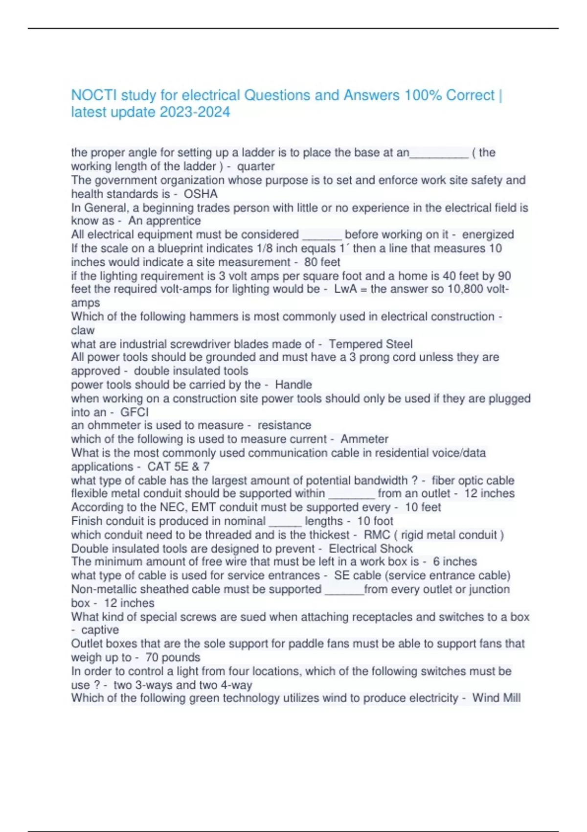 NOCTI study for electrical Questions and Answers 100% Correct | latest update the proper angle for setting up a ladder is to place the base at an_________ ( the working length of the ladder ) - quarter The government organization whose purpose is to set and enforce work site safety and health standards is - OSHA In General, a beginning trades person with little or no experience in the electrical field is know as - An apprentice All electrical equipment must be considered ______ before working on it - energized If the scale on a blueprint indicates 1/8 inch equals 1´ then a line that measures 10 inches would indicate a site measurement - 80 feet if the lighting requirement is 3 volt amps per square foot and a home is 40 feet by 90 feet the required volt-amps for lighting would be - LwA = the answer so 10,800 volt-amps Which of the following hammers is most commonly used in electrical construction - claw what are industrial screwdriver blades made of - Tempered Steel All power tools should be grounded and must have a 3 prong cord unless they are approved - double insulated tools power tools should be carried by the - Handle when working on a construction site power tools should only be used if they are plugged into an - GFCI an ohmmeter is used to measure - resistance which of the following is used to measure current - Ammeter What is the most commonly used communication cable in residential voice/data applications - CAT 5E & 7 what type of cable has the largest amount of potential bandwidth ? - fiber optic cable flexible metal conduit should be supported within _______ from an outlet - 12 inches According to the NEC, EMT conduit must be supported every - 10 feet Finish conduit is produced in nominal _____ lengths - 10 foot which conduit need to be threaded and is the thickest - RMC ( rigid metal conduit ) Double insulated tools are designed to prevent - Electrical Shock The minimum amount of free wire that must be left in a work box is - 6 inches what type of cable is used for service entrances - SE cable (service entrance cable) Non-metallic sheathed cable must be supported ______from every outlet or junction box - 12 inches What kind of special screws are sued when attaching receptacles and switches to a box - captive Outlet boxes that are the sole support for paddle fans must be able to support fans that weigh up to - 70 pounds In order to control a light from four locations, which of the following switches must be use ? - two 3-ways and two 4-way Which of the following green technology utilizes wind to produce electricity - Wind Mill The NEC requires two grounding electrode rods to be driven into the ground a minimum of _______ apart - 6 feet What is the minimum distance between straps on service entrance conductors - 30 inches What is the minimum working space width required at the service panel ? - 30 inches A surface type meter base mounted in a wet location must be mounted so that there is an air space between the meter base and mounting surface. What is the minimum air space ? - 1/4 Service conductors installed as open conductors should have a clearance of not less than___ from doors or windows designed to open ? - 36 inches A minimum clearance of _____ must be maintained between overhead service conductors and residential properties, driveways, and commercial areas not subject to truck traffic - 12 feet Fora one family dwelling the service disconnecting means should have a minimum rating of ______or greater - 100 amps The NEC is based on - NFPA According the to NEC, continuous load is where the maximum current is expected current is exp