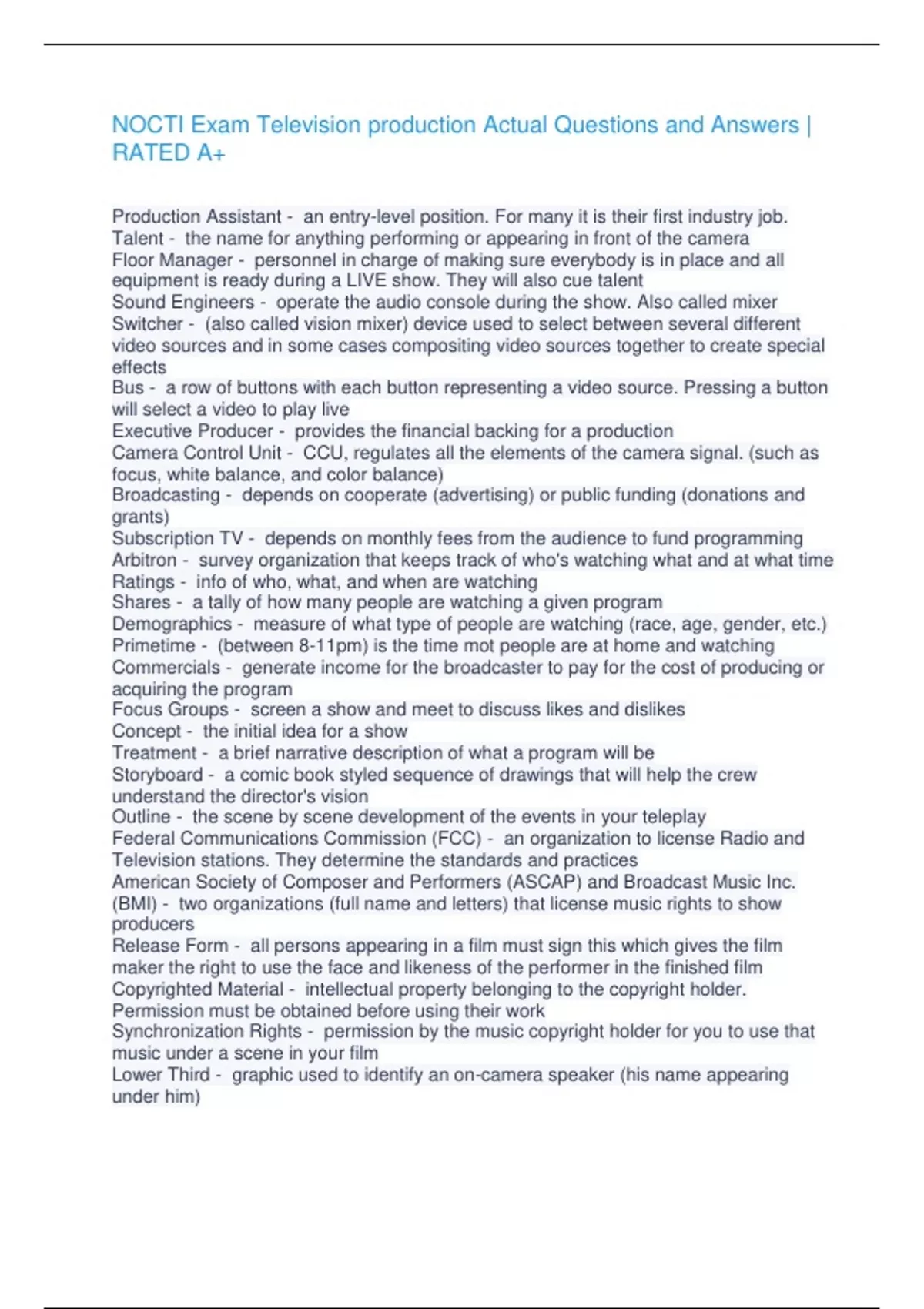 NOCTI Exam Television production Actual Questions and Answers | RATED A+ Production Assistant - an entry-level position. For many it is their first industry job. Talent - the name for anything performing or appearing in front of the camera Floor Manager - personnel in charge of making sure everybody is in place and all equipment is ready during a LIVE show. They will also cue talent Sound Engineers - operate the audio console during the show. Also called mixer Switcher - (also called vision mixer) device used to select between several different video sources and in some cases compositing video sources together to create special effects Bus - a row of buttons with each button representing a video source. Pressing a button will select a video to play live Executive Producer - provides the financial backing for a production Camera Control Unit - CCU, regulates all the elements of the camera signal. (such as focus, white balance, and color balance) Broadcasting - depends on cooperate (advertising) or public funding (donations and grants) Subscription TV - depends on monthly fees from the audience to fund programming Arbitron - survey organization that keeps track of who's watching what and at what time Ratings - info of who, what, and when are watching Shares - a tally of how many people are watching a given program Demographics - measure of what type of people are watching (race, age, gender, etc.) Primetime - (between 8-11pm) is the time mot people are at home and watching Commercials - generate income for the broadcaster to pay for the cost of producing or acquiring the program Focus Groups - screen a show and meet to discuss likes and dislikes Concept - the initial idea for a show Treatment - a brief narrative description of what a program will be Storyboard - a comic book styled sequence of drawings that will help the crew understand the director's vision Outline - the scene by scene development of the events in your teleplay Federal Communications Commission (FCC) - an organization to license Radio and Television stations. They determine the standards and practices American Society of Composer and Performers (ASCAP) and Broadcast Music Inc. (BMI) - two organizations (full name and letters) that license music rights to show producers Release Form - all persons appearing in a film must sign this which gives the film maker the right to use the face and likeness of the performer in the finished film Copyrighted Material - intellectual property belonging to the copyright holder. Permission must be obtained before using their work Synchronization Rights - permission by the music copyright holder for you to use that music un