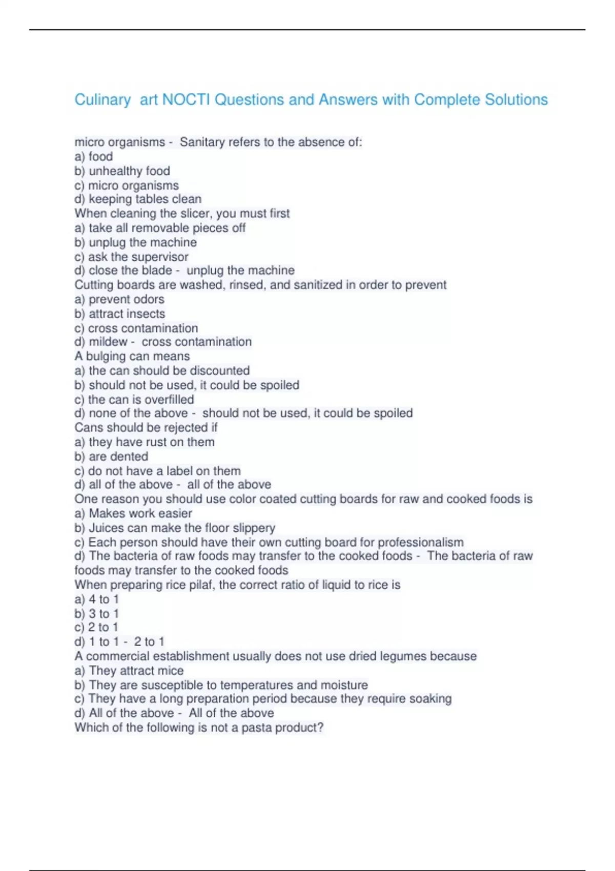 Culinary art NOCTI Questions and Answers with Complete Solutions micro organisms - Sanitary refers to the absence of: a) food b) unhealthy food c) micro organisms d) keeping tables clean When cleaning the slicer, you must first a) take all removable pieces off b) unplug the machine c) ask the supervisor d) close the blade - unplug the machine Cutting boards are washed, rinsed, and sanitized in order to prevent a) prevent odors b) attract insects c) cross contamination d) mildew - cross contamination A bulging can means a) the can should be discounted b) should not be used, it could be spoiled c) the can is overfilled d) none of the above - should not be used, it could be spoiled Cans should be rejected if a) they have rust on them b) are dented c) do not have a label on them d) all of the above - all of the above One reason you should use color coated cutting boards for raw and cooked foods is a) Makes work easier b) Juices can make the floor slippery c) Each person should have their own cutting board for professionalism d) The bacteria of raw foods may transfer to the cooked foods - The bacteria of raw foods may transfer to the cooked foods When preparing rice pilaf, the correct ratio of liquid to rice is a) 4 to 1 b) 3 to 1 c) 2 to 1 d) 1 to 1 - 2 to 1 A commercial establishment usually does not use dried legumes because a) They attract mice b) They are susceptible to temperatures and moisture c) They have a long preparation period because they require soaking d) All of the above - All of the above Which of the following is not a pasta product? a) tortellini b) rice c) elbow macaroni d) egg noodles - rice Which method of cooking will preserve the most nutrients? a) frying b) baking c) boiling d) steaming - steaming How should cooked pasta be stored? a) tossed in oil and cover with clear film b) store uncovered c) store in water d) cover with a damp cloth - tossed in oil and cover with clear film By skimming the scum and fat off of a stock, the stock will become a) more clear b) thinner c) darker d) lighter - a) more clear Herbs tied in a cheesecloth are called a) julienne b) sache c) chaud froid - sache A sauce that is made with clarified butter, pasteurized yolks, lemon juice, salt and water is called a) espagnole b) veloute c) hollandaise d) mayonnaise - hollandaise Oven timers are used as a/an a) set cooking time b) guide for cooking c) temperature recovery time d) none of the above - guide for cooking The most common inventory method is called a) PULL b) PAR c) FIFO d) LIFO - FIFO When storing chemicals, they a) Are stored in their original containers on the floor b) Are stored in bulk at the location of use c) Are stored separately from food d) may be stored with food if in their original container - Are stored separately from food When grease spills on the floor, you should a) lay paper towel down over it b) pour salt over it c) clean it up when you get a chance d) wipe it up immediately - wipe it up immediately A three compartment sink for pots and pans consist of hot soapy water, hot rinse water, and a) water with ammonia b) hot water with iodine c) water with a sanitizer solution d) water with a drying agent - water with a sanitizer solution If the dishwashing machine jams, you should a) reach in and find what is wrong with it b) complain to the supervisor c) shut off the power and hot water d) wash dishes by hand - shut off the power and hot water The first and most important step to cleaning a slicer is a) remove all jewelry b) unplug the machine c) turn it off d) sanitize all parts - unplug the machine If an accident happens in the kitchen, you must immediately a) report it to your supervisor b) go to the hospital c) apply first aid and return to work d) go home - report it to your supervisor In the preparation of beef consommé, egg whites are used as a/an ______agent a) clarifying b) emulsifying c) thickening d) adhesive - Clarifying The difference between New England and Manhattan Clam Chowder is the use of a) onions b) carrots c) celery d) cream - cream A spicy or pungent relish that is used to enhance the flavor of food: a)