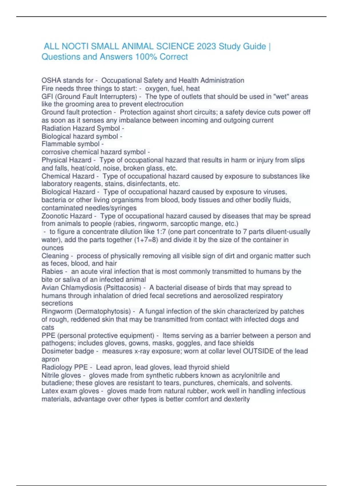 ALL NOCTI SMALL ANIMAL SCIENCE 2023 Study Guide | Questions and Answers 100% Correct OSHA stands for - Occupational Safety and Health Administration Fire needs three things to start: - oxygen, fuel, heat GFI (Ground Fault Interrupters) - The type of outlets that should be used in "wet" areas like the grooming area to prevent electrocution Ground fault protection - Protection against short circuits; a safety device cuts power off as soon as it senses any imbalance between incoming and outgoing current Radiation Hazard Symbol - Biological hazard symbol - Flammable symbol - corrosive chemical hazard symbol - Physical Hazard - Type of occupational hazard that results in harm or injury from slips and falls, heat/cold, noise, broken glass, etc. Chemical Hazard - Type of occupational hazard caused by exposure to substances like laboratory reagents, stains, disinfectants, etc. Biological Hazard - Type of occupational hazard caused by exposure to viruses, bacteria or other living organisms from blood, body tissues and other bodily fluids, contaminated needles/syringes Zoonotic Hazard - Type of occupational hazard caused by diseases that may be spread from animals to people (rabies, ringworm, sarcoptic mange, etc.) - to figure a concentrate dilution like 1:7 (one part concentrate to 7 parts diluent-usually water), add the parts together (1+7=8) and divide it by the size of the container in ounces Cleaning - process of physically removing all visible sign of dirt and organic matter such as feces, blood, and hair Rabies - an acute viral infection that is most commonly transmitted to humans by the bite or saliva of an infected animal Avian Chlamydiosis (Psittacosis) - A bacterial disease of birds that may spread to humans through inhalation of dried fecal secretions and aerosolized respiratory secretions Ringworm (Dermatophytosis) - A fungal infection of the skin characterized by patches of rough, reddened skin that may be transmitted from contact with infected dogs and cats PPE (personal protective equipment) - Items serving as a barrier between a person and pathogens; includes gloves, gowns, masks, goggles, and face shields Dosimeter badge - measures x-ray exposure; worn at collar level OUTSIDE of the lead apron Radiology PPE - Lead apron, lead gloves, lead thyroid shield Nitrile gloves - gloves made from synthetic rubbers known as acrylonitrile and butadiene; these gloves are resistant to tears, punctures, chemicals, and solvents. Latex exam gloves - gloves made from natural rubber, work well in handling infectious materials, advantage over other types is better comfort and dexterity vinyl exam gloves - gloves with less durability, economical, best for non-hazardous material use, looser fit, latex free Disinfecting - process of destroying MOST microorganisms on nonliving things by physical or chemical means Sterilizing - process of destroying all microorganisms and viruses on an object using chemical and/or extreme heat or cold under pressure Cold Sterilization - the process of soaking items in a disinfectant chemical until they are necessary for reuse Steam autoclave - Equipment using direct exposure to steam under pressure at a required temperature for a specified time (Steam, pressure, temperature, time--4 parameters per the CDC) to kill ALL microorganisms. Ultrasonic cleaner - passing high frequency sound waves through a solution create a vibration that scrubs an object (usually surgical instruments) to remove debris Filtration - A process that separates materials based on the size of their particles. Mechanical filter - physical barrier to particles biological filter - filter which supports the colonization of nitrifying bacteria (grow bed/media bed also performs this function) Inhalation, skin contact or eye contact, ingestion, injection - Four major routes by which chemicals may enter the body breathing (through the nose) - the most common way workplace chemicals enter the body skin or eye contact - the second most common way workplace chemicals enter the body SDS - Document listing information pertaining to the use of, safety, first aid, and handling of chemicals that must be on file in the work place. sharps container - A puncture-proof container designed specifically to safely dispose of needles, scalpels, and other sharp disposable medical instruments Contact time - The exposure time for a disinfectant to accomplish the desired antimicrobial effect, as defined by the disinfectant manufacturer. Phenols - disinfectant that should NOT be used near cats due to toxicity potential Infectious disease - disease spread through direct or indirect contact with pathogenic microorganisms such as bacteria, viruses, parasites, etc. Isolation Ward - where contagious patients are kept away from all healthy patients Professional Dress - attire appropriate for your workplace Least - When restraining an animal, we want to use the _____________ amount of restraint possible to accomplish the procedure while keeping the patient safe. Restraint - Limiting an animal's normal voluntary movement for purposes of examination, collection of samples, therapy, etc. through physical, psychological, or chemical means Hamster restraint - scoop or scruff whole body. Will bite so control head. Rat restraint - Grasping this small mammal by encircling the shoulders with your thumb under the mandible teeth chattering - A sign heard in rats demonstrating contentment Rabbit restraint - Careful ______________________avoids potential to luxate spine or break legs; never lift by the ears or scruff; always support the lower body. anogenital distance - area between the anus and genitalia; females have a shorter anogenital distance than males, which is used to determine the sex of rodents most commonly Escape routes - Before removing animals from kennels, cages, etc. be aware of any potential _______________ __________________. life expectancy - In general, the smaller the breed of dog the greater its ____________________ ___________