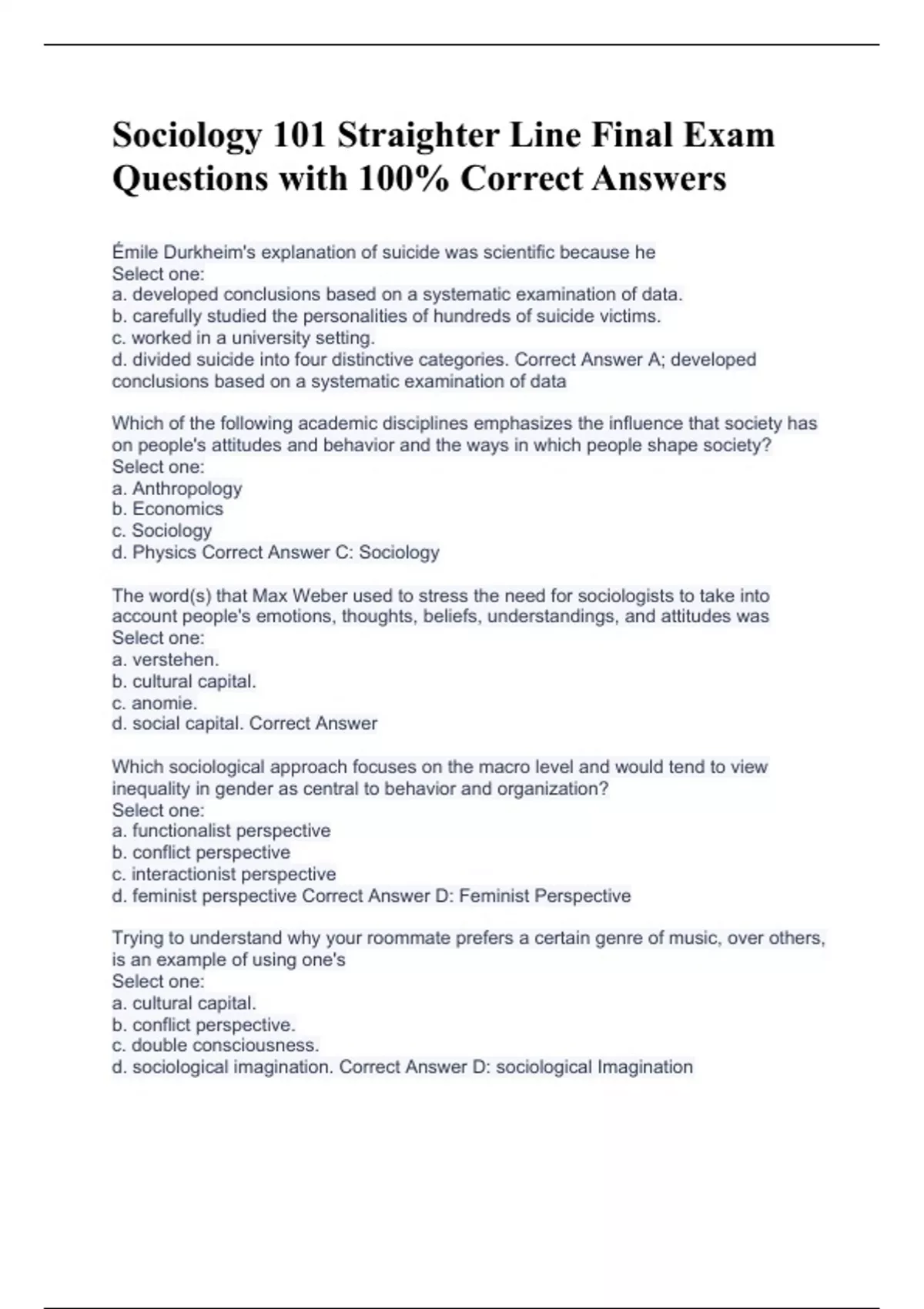 Émile Durkheim's explanation of suicide was scientific because he Select one: a. developed conclusions based on a systematic examination of data. b. carefully studied the personalities of hundreds of suicide victims. c. worked in a university setting. d. divided suicide into four distinctive categories. Correct Answer A; developed conclusions based on a systematic examination of data Which of the following academic disciplines emphasizes the influence that society has on people's attitudes and behavior and the ways in which people shape society? Select one: a. Anthropology b. Economics c. Sociology d. Physics Correct Answer C: Sociology The word(s) that Max Weber used to stress the need for sociologists to take into account people's emotions, thoughts, beliefs, understandings, and attitudes was Select one: a. verstehen. b. cultural capital. c. anomie. d. social capital. Correct Answer Which sociological approach focuses on the macro level and would tend to view inequality in gender as central to behavior and organization? Select one: a. functionalist perspective b. conflict perspective c. interactionist perspective d. feminist perspective Correct Answer D: Feminist Perspective Trying to understand why your roommate prefers a certain genre of music, over others, is an example of using one's Select one: a. cultural capital. b. conflict perspective. c. double consciousness. d. sociological imagination. Correct Answer D: sociological Imagination