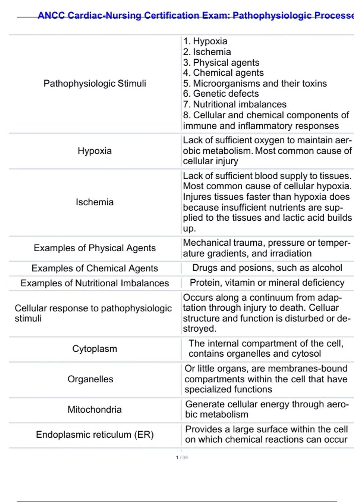 Pathophysiologic Stimuli Hypoxia Ischemia Examples of Physical Agents Examples of Chemical Agents Examples of Nutritional Imbalances Cellular response to pathophysiologic stimuli Cytoplasm Organelles Mitochondria Endoplasmic reticulum (ER) 1. Hypoxia 2. Ischemia 3. Physical agents 4. Chemical agents 5. Microorganisms and their toxins 6. Genetic defects 7. Nutritional imbalances 8. Cellular and chemical components of immune and inflammatory responses Lack of sufficient oxygen to maintain aer- obic metabolism. Most common cause of cellular injury Lack of sufficient blood supply to tissues. Most common cause of cellular hypoxia. Injures tissues faster than hypoxia does because insufficient nutrients are sup- plied to the tissues and lactic acid builds up. Mechanical trauma, pressure or temper- ature gradients, and irradiation Drugs and posions, such as alcohol Protein, vitamin or mineral deficiency Occurs along a continuum from adaptation through injury to death. Celluar structure and function is disturbed or de- stroyed. The internal compartment of the cell, contains organelles and cytosol Or little organs, are membranes-bound compartments within the cell that have specialized functions Generate cellular energy through aero- bic metabolism Provides a large surface within the cell on which chemical reactions can occur ANCC Cardiac-Nursing Certification Exam: Pathophysiologic Processes 2 / 39 Ribosomes Golgi Apparatus Lysosomes Perioxisomes Nucleus Deoxyribonucleic acid (DNA) Cytsosol Plasma membrane Characteristics of the plasma membrane Proteins Lipid bilayer Cell junctions Synthesize protein Processes and packages chemical for transport to more distant cells. Also pro- duces polysaccharides, modifies some activating enzyes and produce lyso- somes.Contain digestive enzymes Contain oxidative enzymes. Play a major role in lipid metabolism Contains large quantities of deoxyri- bonucleic acid Forms the genes that regulate and differ- entiate cell function The fluid medium in which the organelles are suspended Surrounds the entire cell and separates intracellular and extracellular fluid com- partments. 1. Consists of a double layer of lipid mol- ecules 2. Proteins that exchange material between the cell and its environment 3. Damage to or altered function of the plasma membrane is common, early re- sponse to pathophysiologic stimuli Anchored on or in the lipid bilayer, trasnport and exchange material between the cell and its environment Double layer of lipid molecules Specialized regions on the plasma mem- brane that link individual cells into tissues and allow small molecules to pass from cell to cell.
