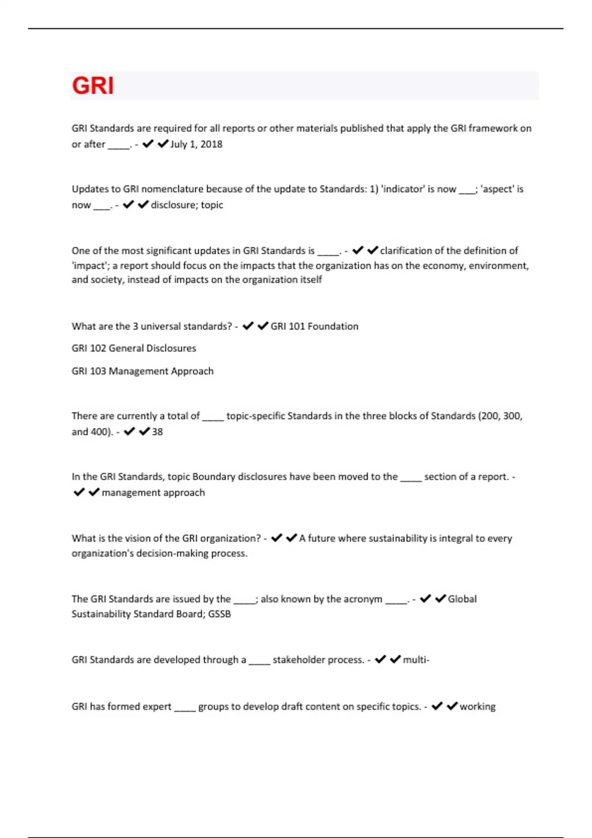 GRI Standards are required for all reports or other materials published that apply the GRI framework on or after ____. - July 1, 2018 Updates to GRI nomenclature because of the update to Standards: 1) 'indicator' is now ___; 'aspect' is now ___. - disclosure; topic One of the most significant updates in GRI Standards is ____. - clarification of the definition of 'impact'; a report should focus on the impacts that the organization has on the economy, environment, and society, instead of impacts on the organization itself What are the 3 universal standards? - GRI 101 Foundation GRI 102 General Disclosures GRI 103 Management Approach There are currently a total of ____ topic-specific Standards in the three blocks of Standards (200, 300, and 400). - 38 In the GRI Standards, topic Boundary disclosures have been moved to the ____ section of a report. - management approach What is the vision of the GRI organization? - A future where sustainability is integral to every organization's decision-making process. The GRI Standards are issued by the ____; also known by the acronym ____. - Global Sustainability Standard Board; GSSB GRI Standards are developed through a ____ stakeholder process. - multiGRI has formed expert ____ groups to develop draft content on specific topics. - workingWhat are the 6 GRI expert working groups? - Academia Business Capital Markets Civil Society Governments Labor Define 'disclosure'. - Specific information that is to be reported. Define 'topic'. - An economic, environmental, or social subject. Define 'material topic'. - A topic that reflects an organization's significant economic, environmental and social impacts or that substantively influences the assessments and decisions of stakeholders. Define 'management approach disclosure'. - A narrative description about how an organization manages its material topics and their related impacts. Define 'GRI content index'. - A navigation tool that specifies GRI Standards used and disclosures made, and the location of these in the report.
