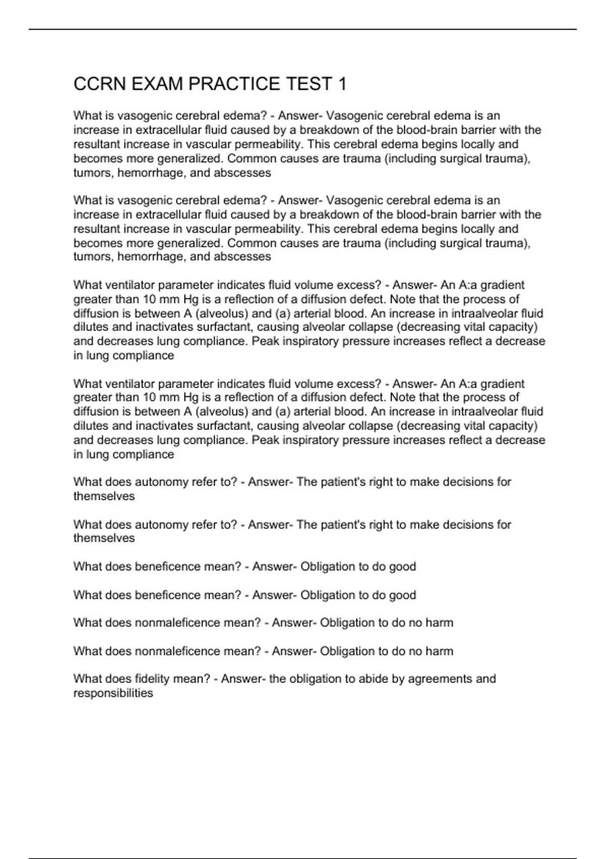 What is vasogenic cerebral edema? - Answer- Vasogenic cerebral edema is an increase in extracellular fluid caused by a breakdown of the blood-brain barrier with the resultant increase in vascular permeability. This cerebral edema begins locally and becomes more generalized. Common causes are trauma (including surgical trauma), tumors, hemorrhage, and abscesses What is vasogenic cerebral edema? - Answer- Vasogenic cerebral edema is an increase in extracellular fluid caused by a breakdown of the blood-brain barrier with the resultant increase in vascular permeability. This cerebral edema begins locally and becomes more generalized. Common causes are trauma (including surgical trauma), tumors, hemorrhage, and abscesses What ventilator parameter indicates fluid volume excess? - Answer- An A:a gradient greater than 10 mm Hg is a reflection of a diffusion defect. Note that the process of diffusion is between A (alveolus) and (a) arterial blood. An increase in intraalveolar fluid dilutes and inactivates surfactant, causing alveolar collapse (decreasing vital capacity) and decreases lung compliance. Peak inspiratory pressure increases reflect a decrease in lung compliance What ventilator parameter indicates fluid volume excess? - Answer- An A:a gradient greater than 10 mm Hg is a reflection of a diffusion defect. Note that the process of diffusion is between A (alveolus) and (a) arterial blood. An increase in intraalveolar fluid dilutes and inactivates surfactant, causing alveolar collapse (decreasing vital capacity) and decreases lung compliance. Peak inspiratory pressure increases reflect a decrease in lung compliance What does autonomy refer to? - Answer- The patient's right to make decisions for themselves What does autonomy refer to? - Answer- The patient's right to make decisions for themselves What does beneficence mean? - Answer- Obligation to do good What does beneficence mean? - Answer- Obligation to do good What does nonmaleficence mean? - Answer- Obligation to do no harm What does nonmaleficence mean? - Answer- Obligation to do no harm What does fidelity mean? - Answer- the obligation to abide by agreements and res
