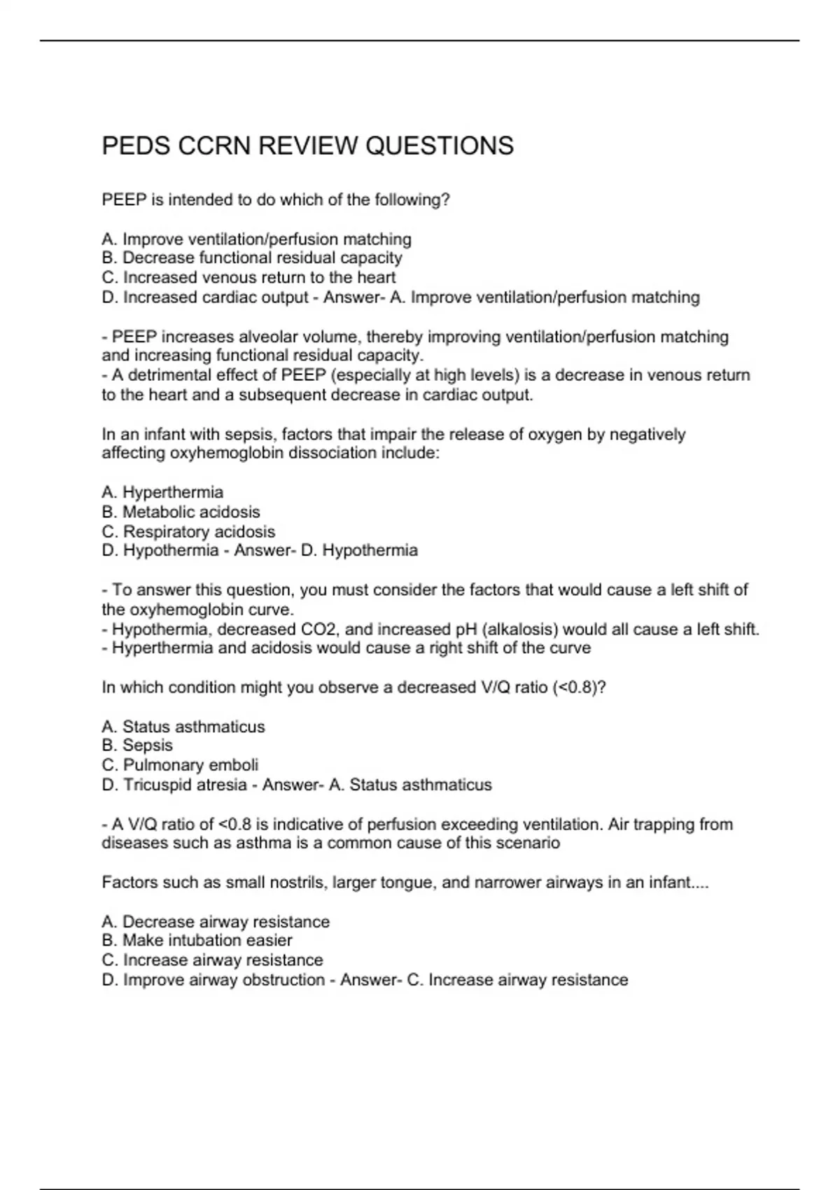 PEEP is intended to do which of the following? A. Improve ventilation/perfusion matching B. Decrease functional residual capacity C. Increased venous return to the heart D. Increased cardiac output - Answer- A. Improve ventilation/perfusion matching - PEEP increases alveolar volume, thereby improving ventilation/perfusion matching and increasing functional residual capacity. - A detrimental effect of PEEP (especially at high levels) is a decrease in venous return to the heart and a subsequent decrease in cardiac output. In an infant with sepsis, factors that impair the release of oxygen by negatively affecting oxyhemoglobin dissociation include: A. Hyperthermia B. Metabolic acidosis C. Respiratory acidosis D. Hypothermia - Answer- D. Hypothermia - To answer this question, you must consider the factors that would cause a left shift of the oxyhemoglobin curve. - Hypothermia, decreased CO2, and increased pH (alkalosis) would all cause a left shift. - Hyperthermia and acidosis would cause a right shift of the curve In which condition might you observe a decreased V/Q ratio (<0.8)? A. Status asthmaticus B. Sepsis C. Pulmonary emboli D. Tricuspid atresia - Answer- A. Status asthmaticus - A V/Q ratio of <0.8 is indicative of perfusion exceeding ventilation. Air trapping from diseases such as asthma is a common cause of this scenario Factors such as small nostrils, larger tongue, and narrower airways in an infant.... A. Decrease airway resistance B. Make intubation easier C. Increase airway resistance D. Improve airway obstruction - Answer- C. Increase airway resistance
