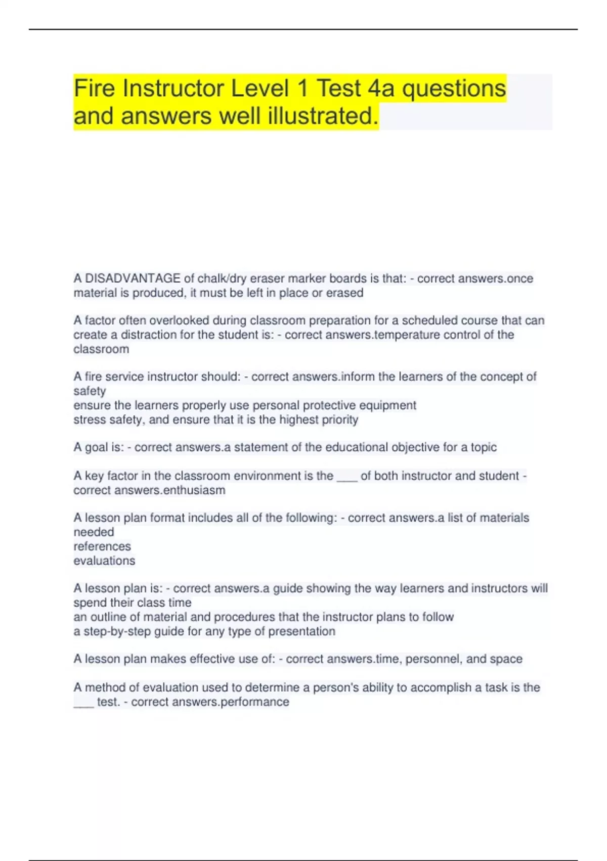 Fire Instructor Level 1 Test 4a questions and answers well illustrated. A DISADVANTAGE of chalk/dry eraser marker boards is that: - correct material is produced, it must be left in place or erased A factor often overlooked during classroom preparation for a scheduled course that can create a distraction for the student is: - correct rature control of the classroom A fire service instructor should: - correct m the learners of the concept of safety ensure the learners properly use personal protective equipment stress safety, and ensure that it is the highest priority A goal is: - correct answers.a statement of the educational objective for a topic A key factor in the classroom environment is the ___ of both instructor and student - correct siasm A lesson plan format includes all of the following: - correct answers.a list of materials needed references evaluations A lesson plan is: - correct answers.a guide showing the way learners and instructors will spend their class time an outline of material and procedures that the instructor plans to follow a step-by-step guide for any type of presentation A lesson plan makes effective use of: - correct , personnel, and space A method of evaluation used to determine a person's ability to accomplish a task is the ___ test. - correct rmance A method of instruction used when students act out situations is known as: - correct playing A pretest is used by instructors to: - correct mine the current level of training and skills A problem encountered with using handouts of objects as instructional media is that learners: - correct their attention divided between the instructor and the item(s) they are examining A reliable test: - correct the quality of consistent measurement A test that compares a learner's performance against a predetermined standard is known as a ____ test. - correct rion-referenced A test that gives consistent results is: - correct ble A test that measures what it is supposed to measure is a ___test. - correct A type of evaluation that can be used throughout a course delivery (pop quizzes or tests) and provides immediate feedback is a ___ evaluation. - correct tive A written test that may be difficult to score because more than one answer may be correct is the: - correct answer A___ test attempts to measure knowledge levels among learners. - correct -referenced A_____ is a road map that guides the instructor through the topic. - correct n plan A ___ scans and prints a reduced-sized copy of material drawn or printed on a dry erase marker board - correct ronic copy board A(n)____ can create interesting and informative lectures by providing information that will affect various senses. - correct am display All of the following are considered visual aids : - correct ation kits pictures, films, or slides easel pads An accident analysis is conducted to achieve all of the following: - correct ose the nature and size of the accident problem identify the need for engineering revisions identify problems in operating procedure/guidelines An accident investigation report should document: - correct An accident investigation should be: - correct tive and free of personal feelings An accident investigator should include identification of all of the following: - correct prinicipal sources of accidents problems in operating procedures unsafe conditions of equipment An acronym used to establish the relevance of the topic to the student's needs is ACID, which stands for Attention,Curiosity,______ and Desire. - correct answers.Interest An instructor must be prepared for unanticipated situations, including: - correct ment weather learning style differences equipment variation Analyzing circumstances surrounding accidents can enable an instructor to: - correct ify and locate principle sources of accidents disclose the nature and size of accident problems in different operations indicate the need for engineering revisions by identifying unsafe conditions of various types of equipment As an instructor, policies and procedures affect you in performing your duties, in which of the following areas would you most likely NOT have a policy or procedure? - correct nt overtime pay At the beginning of a presentation, the instructor should clearly state: - correct objective of the lesson Audiovisual equipment should be loaded and checked: - correct e each class Before using any training audiovisual aids, the instructor must: - correct ew the audiovisual aid prior to class Cheating on tests can be minimized by: - correct arly revising tests special seating arrangements careful monitoring during tests Teaching skills: - correct answers.An instructor should present the skill at a mastery level An instructor may introduce a skill in steps