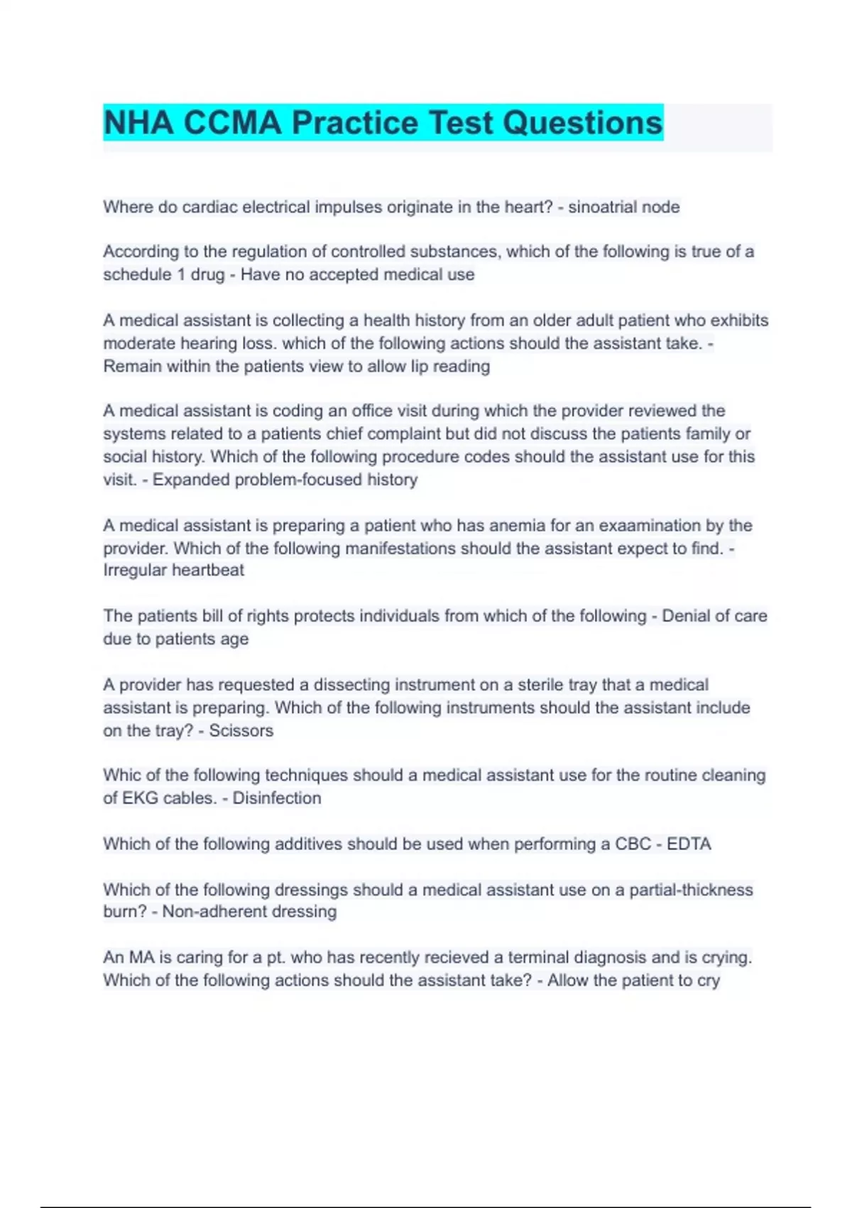 NHA CCMA Practice Test Questions 2023 verified with complete solution Where do cardiac electrical impulses originate in the heart? - sinoatrial node According to the regulation of controlled substances, which of the following is true of a schedule 1 drug - Have no accepted medical use A medical assistant is collecting a health history from an older adult patient who exhibits moderate hearing loss. which of the following actions should the assistant take. - Remain within the patients view to allow lip reading A medical assistant is coding an office visit during which the provider reviewed the systems related to a patients chief complaint but did not discuss the patients family or social history. Which of the following procedure codes should the assistant use for this visit. - Expanded problem-focused history