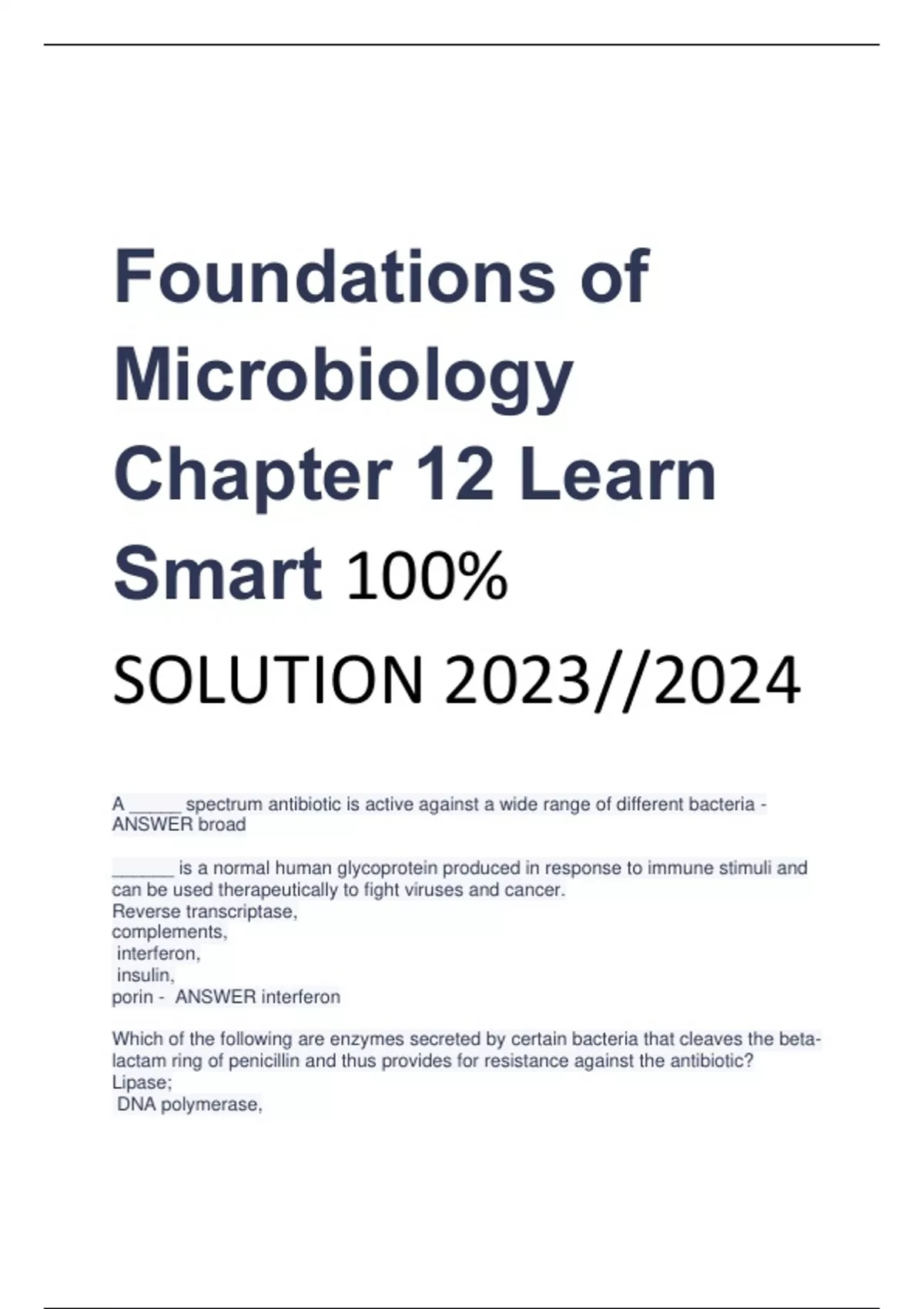 Foundations of Microbiology Chapter 12 Learn Smart 100% SOLUTION 2023//2024 A _____ spectrum antibiotic is active against a wide range of different bacteria - ANSWER broad ______ is a normal human glycoprotein produced in response to immune stimuli and can be used therapeutically to fight viruses and cancer. Reverse transcriptase, complements, interferon, insulin, porin - ANSWER interferon Which of the following are enzymes secreted by certain bacteria that cleaves the betalactam ring of penicillin and thus provides for resistance against the antibiotic? Lipase; DNA polymerase, alpha helicase, beta lactamase, penicillinase - ANSWER beta lactamase, penicillinase Beta-lactamase and _____ are enzymes that hydrolyzes penicillin and are found in penicillin-resistant strains of bacteria. - ANSWER penicillinase Methicillin, dicloxacillin, and oxacillin are useful in treating infections caused by _____- producing bacteria. - ANSWER penicillinase _____is when one microorganism inhibits the growth of other microorganisms living in the same habitat. - ANSWER Antagonism Competitive inhibition is when a particular enzyme is blocked from action after it interacts with a substance that mimics the normal _____for the enzyme. - ANSWER substrate ______inhibition of an enzyme occurs when the enzyme is blocked from action after a substance that mimics the normal substrate binds to the active site. Noncompetitive; Feedback, Oxidative, Competitive - ANSWER Competitive Which name is used to describe common and mostly harmless microbes found on the skin and within the GI tract? E. coli; pathogens, normal flora, nosocomial - ANSWER normal flora ______ drugs are completely synthesized in the laboratory by chemical reactions. - ANSWER Synthetic A drug that is isolated from natural sources and then modified in the laboratory is called a _______ drug. - ANSWER semisynthetic Synthetic drugs are made entirely in the laboratory using ______ reactions. - ANSWER chemical Advantages of semisynthetic penicillins over natural penicillins include: increased spectrum; increases susceptibility to penicillinases; decreased allergic reactions; increased movement across gram-negative cell walls. - ANSWER increased spectrum increased movement across gram-negative cell walls An all-inclusive term for any drug used to fight an infection, regardless of its origin or type is ______ - ANSWER antimicrobial Which of the following are the three factors that should be known before selecting an antimicrobial drug? The sensitivity of the infecting agent; the nature of the infecting agent; the overall health of the patient; the patient's prior history of exposure to the infecting agent; the prevalence of the infecting agent in other patients - ANSWER The sensitivity of the infecting agent; the nature of the infecting agent; the overall health of the patient; The use of a drug to prevent imminent infection of a person at risk is called prophylaxis; chemotherapy; antibiotic; antagonism - ANSWER prophylaxis _____ is where microbes begin to tolerate an antimicrobial agent at a level which would normally be inhibitory. - ANSWER Drug resistance The tolerance of an antimicrobial agent at a level which would normally be inhibitory is called drug resistance; synergism; molecular rebound; competitive exclusion - ANSWER drug resistance Drug resistance resulting from organisms that survive exposure to a particular drug is due to _____ selection - ANSWER natural Which term describes the process of some microbes dying while other live in the presence of antimicrobial agents? Microbial antagonism, natural selection, survival of the fittest, evolution - ANSWER natural selection Survival of the fittest is slang term for _____ - ANSWER natural selection The therapeutic index is the ration of the _____ dose to the _____ dose that is used to assess the safety and reliability of the drug. - ANSWER toxic; effective