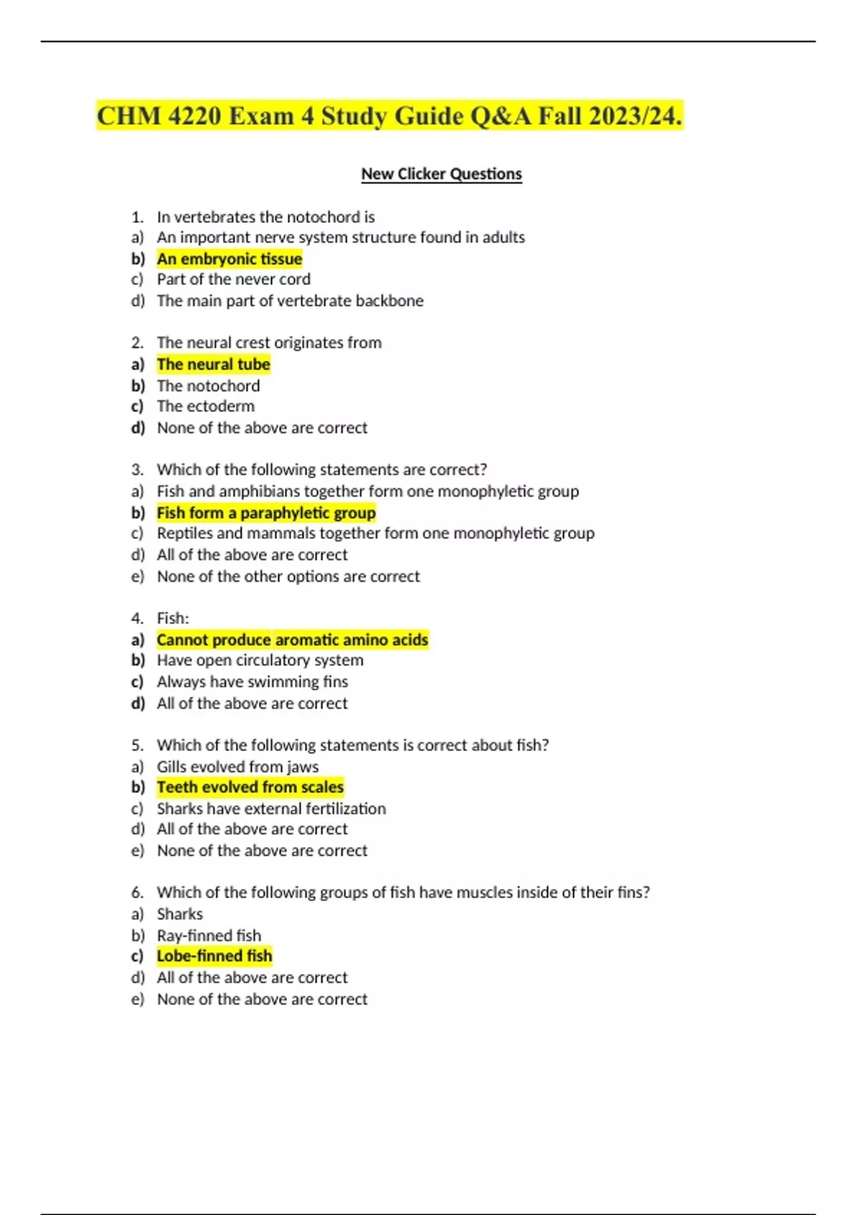 CHM 4220 Exam 4 Study Guide Q&A Fall 2023/24. New Clicker Questions 1. In vertebrates the notochord is a) An important nerve system structure found in adults b) An embryonic tissue c) Part of the never cord d) The main part of vertebrate backbone 2. The neural crest originates from a) The neural tube b) The notochord c) The ectoderm d) None of the above are correct 3. Which of the following statements are correct? a) Fish and amphibians together form one monophyletic group b) Fish form a paraphyletic group c) Reptiles and mammals together form one monophyletic group d) All of the above are correct e) None of the other options are correct 4. Fish: a) Cannot produce aromatic amino acids b) Have open circulatory system c) Always have swimming fins d) All of the above are correct 5. Which of the following statements is correct about fish? a) Gills evolved from jaws b) Teeth evolved from scales
