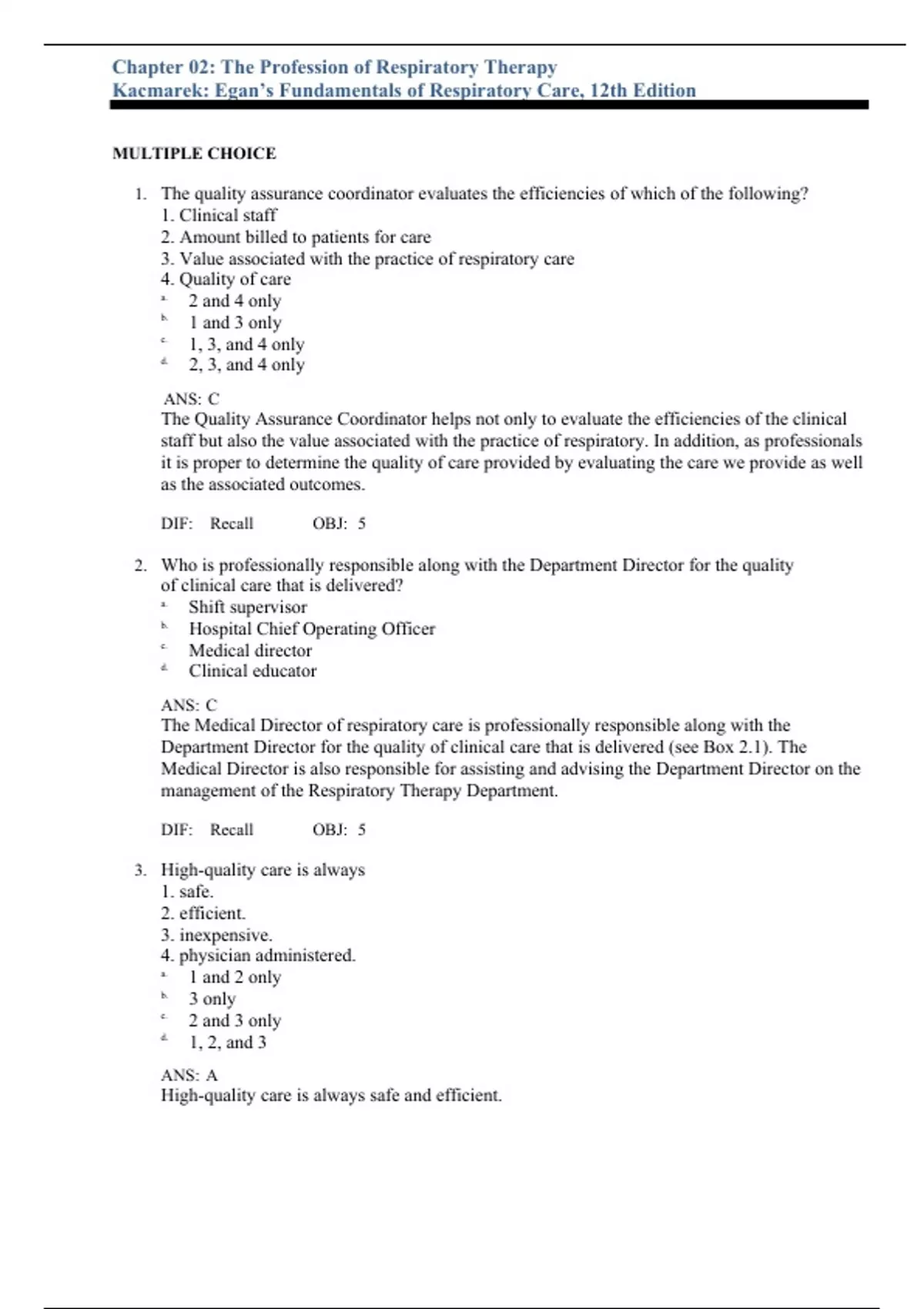 1. The quality assurance coordinator evaluates the efficiencies of which of the following? 1. Clinical staff 2. Amount billed to patients for care 3. Value associated with the practice of respiratory care 4. Quality of care a. 2 and 4 only b. 1 and 3 only c. 1, 3, and 4 only d. 2, 3, and 4 only ANS: C The Quality Assurance Coordinator helps not only to evaluate the efficiencies of the clinical staff but also the value associated with the practice of respiratory. In addition, as professionals it is proper to determine the quality of care provided by evaluating the care we provide as well as the associated outcomes. DIF: Recall OBJ
