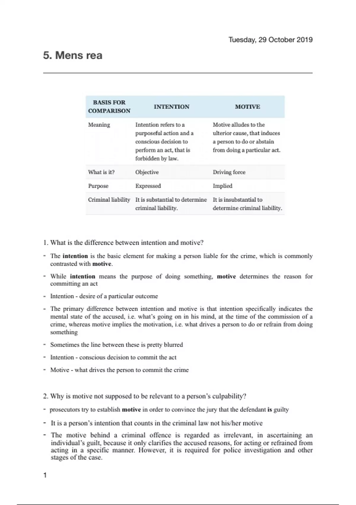 1. What is the difference between intention and motive?