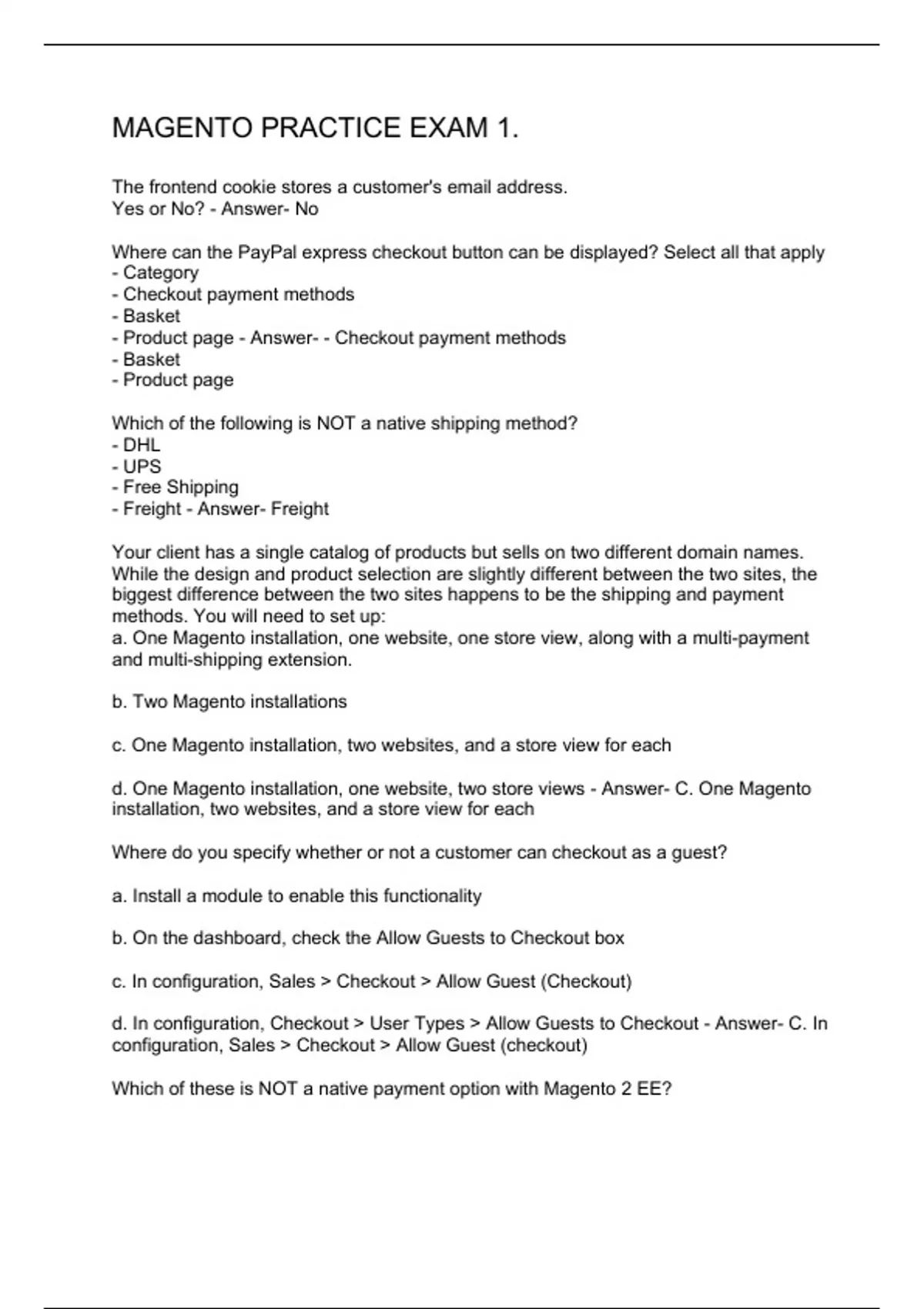 The frontend cookie stores a customer's email address. Yes or No? - Answer- No Where can the PayPal express checkout button can be displayed? Select all that apply - Category - Checkout payment methods - Basket - Product page - Answer- - Checkout payment methods - Basket - Product page Which of the following is NOT a native shipping method? - DHL - UPS - Free Shipping - Freight - Answer- Freight Your client has a single catalog of products but sells on two different domain names. While the design and product selection are slightly different between the two sites, the biggest difference between the two sites happens to be the shipping and payment methods. You will need to set up: a. One Magento installation, one website, one store view, along with a multi-payment and multi-shipping extension. b. Two Magento installations c. One Magento installation, two websites, and a store view for each d. One Magento installation, one website, two store views - Answer- C. One Magento installation, two websites, and a store view for each Where do you specify whether or not a customer can checkout as a guest? a. Install a module to enable this functionality b. On the dashboard, check the Allow Guests to Checkout box c. In configuration, Sales Checkout Allow Guest (Checkout) d. In configuration, Checkout User Types Allow Guests to Checkout - Answer- C. In configuration, Sales Checkout Allow Guest (checkout) Whic