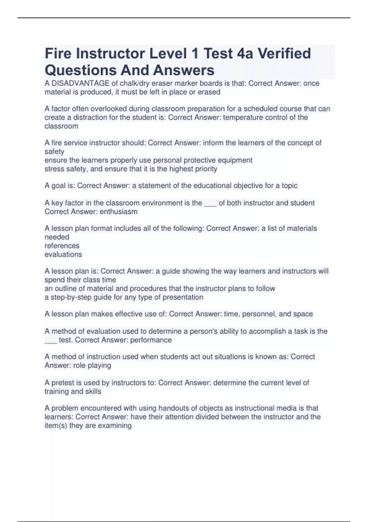 Fire Instructor Level 1 Test 4a Verified Questions And Answers A DISADVANTAGE of chalk/dry eraser marker boards is that: Correct Answer: once material is produced, it must be left in place or erased A factor often overlooked during classroom preparation for a scheduled course that can create a distraction for the student is: Correct Answer: temperature control of the classroom A fire service instructor should: Correct Answer: inform the learners of the concept of safety ensure the learners properly use personal protective equipment stress safety, and ensure that it is the highest priority