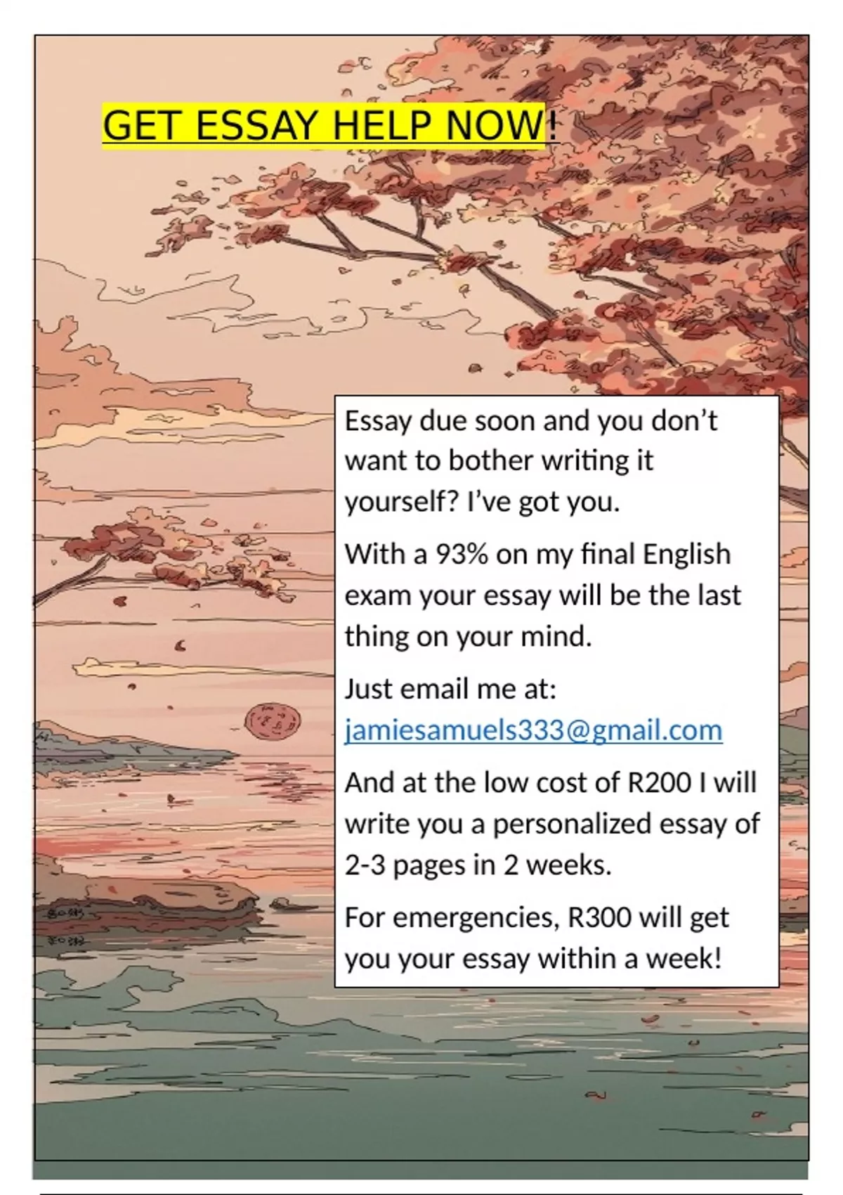Got an essay due soon that you really dont have the time to write yourself? Stress no further. With a 93% in my final english essay I'll help you get the grades you want. For a personalised essay contact: