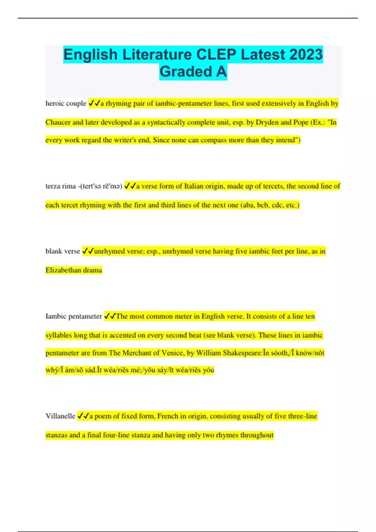 English Literature CLEP Latest 2023 Graded A heroic couple a rhyming pair of iambic-pentameter lines, first used extensively in English by Chaucer and later developed as a syntactically complete unit, esp. by Dryden and Pope (Ex.: "In every work regard the writer's end, Since none can compass more than they intend") terza rima -(tert′sə rē′mə) a verse form of Italian origin, made up of tercets, the second line of each tercet rhyming with the first and third lines of the next one (aba, bcb, cdc, etc.) blank verse unrhymed verse; esp., unrhymed verse having five iambic feet per line, as in Elizabethan drama Iambic pentameter The most common meter in English verse. It consists of a line ten syllables long that is accented on every second beat (see blank verse). These lines in iambic pentameter are from The Merchant of Venice, by William Shakespeare:Ĭn sóoth,/Ĭ knów/nŏt whý/Ĭ ám/sŏ sád.Ĭt wéa/riĕs mé;/yŏu sáy/ĭt wéa/riĕs yóu Villanelle a poem of fixed form, French in origin, consisting usually of five three-line stanzas and a final four-line stanza and having only two rhymes throughout Dramatic Monologue A literary, usually verse composition in which a speaker reveals his or her character, often in relation to a critical situation or event, in a monologue addressed to the reader or to a presumed listener. Simile a figure of speech in which one thing is likened to another, dissimilar thing by the use of like, as, etc. (Ex.: a heart as big as a whale, her tears flowed like wine) Epic Simile An extended simile elaborated in great detail. Also called Homeric simile Irony a method of humorous or subtly sarcastic expression in which the intended meaning of the words is the direct opposite of their usual sense: the irony of calling a stupid plan "clever" Dramatic Irony the contrast, as in a play, between what a character thinks the truth is, as revealed in a speech or action, and what an audience or reader knows the truth Harangue a long, blustering, noisy, or scolding speech; tirade ro•man à clef (rō′män nä klā′) a novel in which real persons appear under fictitious names Picaresque designating or characteristic of a kind of fiction that originated in Spain and deals episodically with the adventures of a hero who is or resembles such a vagabond or rogue Epistolary Novels written in the form of a series of letters exchanged by the characters, as certain novels of the 18th cent. Vignette a short, carefully constructed scene in a film, play, etc.; specif., one regarded as subtle, sensitive, etc Serialized Novels to put or publish. Published novel Metaphor A figure of speech in which an implicit comparison is made between two unlike things that actually have something in common Ex: Her home was a prison. Hyperbole is a figure of speech that uses an exaggerated or extravagant statement to create a strong emotional response. As a figure of speech it is not intended to be taken literally. Hyperbole is frequently used for humour. Examples of hyperbole are: They ran like greased lightning Rhyming Couplet A couplet is a pair of lines of verse. It usually consists of two lines that rhyme and have the same meter. While traditionally couplets rhyme, not all do Abstraction anything that isn't tangible. In literature, it can be opposed to imagery, the representation of tangible things Aestheticism a movement that took place near the end of the nineteenth century that aimed to free art from conventional Victorian morality Allegory an extended metaphor used in a drama or narrative Alliteration the repetition of consonant sounds close to each other Anacoluthon a sentence that changes its grammatical structure in the middle, often suggest disturbance or excitement. For example: "we had almost reached the finished line and then the race had to have been fixed from the beginning" Anadiplosis repetition at the start of a sentence of the concluding word or phrase in the previous sentence. For example: "There's only so much exercise you can get on a plane. A air plane is not the greatest place to work out" Antistrophe one of three sections of the Greek dramatic chorus and the Pindaric ode, along with the strophe and epode. These forms may be repeated in sequence within a single ode. Aporia a term used in deconstruction, absence of meaning and multiplicity of possible meaning within a text Assonance the repetition of vowel sounds close to each other Aubade a lyric from stemming from the Middle Ages that treats the subject of two lovers waking up together. It may deal with the joy of being together or with the sorrow of having to part. Bidungsroman a novel that traces the development of a young person from childhood or adolescence to maturity. It is often written in the form of an autobiography Canon an unofficial grouping of works by authors whose importance has become generally recognized by literature scholars. Chiasmus a verbal pattern in two parts in which the second part is like a mirror image of the first. Condition of England novel a novel concerned with the negative social and economic impacts of industrialism Connotation the secondary significance a word acquires through association that goes beyond its literal meaning Cycle a collection of works on a common theme such as Charlemagne or the Trojan War. Cycles typically represent the work of several different authors brought together into a group. Cycles are often groups of romance narrative. Eclogues pastoral lyrics- pomes that idealize life of shepherds Enjambment the continuation of the grammatical flow from one line of verse to the next Epic heroic poetry with an important subject of crucial national or cultural significance, together with a grand, lofty tone. Many epics tell the story of the founding of a nation or race by means of battle or journey Epistles letters, usually formal Epistolary novel a novel made up of correspondence between characters Epithalamium a poem that treats the subject of the couple's wedding nigh