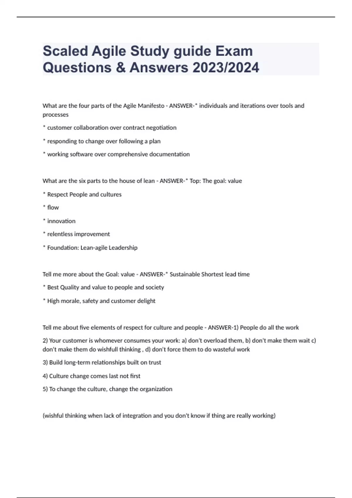 Scaled Agile Study guide Exam Questions & Answers 2023/2024 What are the four parts of the Agile Manifesto - ANSWER-* individuals and iterations over tools and processes * customer collaboration over contract negotiation * responding to change over following a plan * working software over comprehensive documentation What are the six parts to the house of lean - ANSWER-* Top: The goal: value * Respect People and cultures * flow * innovation * relentless improvement * Foundation: Lean-agile Leadership Tell me more about the Goal: value - ANSWER-* Sustainable Shortest lead time * Best Quality and value to people and society * High morale, safety and customer delight Tell me about five elements of respect for culture and people - ANSWER-1) People do all the work 2) Your customer is whomever consumes your work: a) don't overload them, b) don't make them wait c) don't make them do wishfull thinking , d) don't force them to do wasteful work 3) Build long-term relationships built on trust 4) Culture change comes last not first 5) To change the culture, change the organization (wishful thinking when lack of integration and you don't know if thing are really working)
