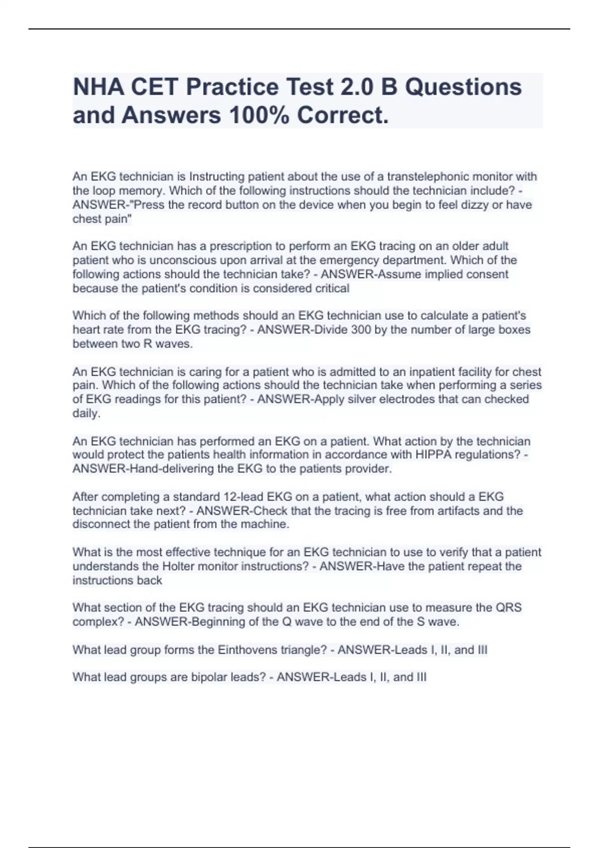 An EKG technician is Instructing patient about the use of a transtelephonic monitor with the loop memory. Which of the following instructions should the technician include? - ANSWER-"Press the record button on the device when you begin to feel dizzy or have chest pain" An EKG technician has a prescription to perform an EKG tracing on an older adult patient who is unconscious upon arrival at the emergency department. Which of the following actions should the technician take? - ANSWER-Assume implied consent because the patient's condition is considered critical Which of the following methods should an EKG technician use to calculate a patient's heart rate from the EKG tracing? - ANSWER-Divide 300 by the number of large boxes between two R waves. An EKG technician is caring for a patient who is admitted to an inpatient facility for chest pain. Which of the following actions should the technician take when performing a series of EKG readings for this patient? - ANSWER-Apply silver electrodes that can checked daily. An EKG technician has performed an EKG on a patient. What action by the technician would protect the patients health information in accordance with HIPPA regulations? - ANSWER-Hand-delivering the EKG to the patients provider. After completing a standard 12-lead EKG on a patient, what action should a EKG technician take next? - ANSWER-Check that the tracing is free from artifacts and the disconnect the patient from the machine.