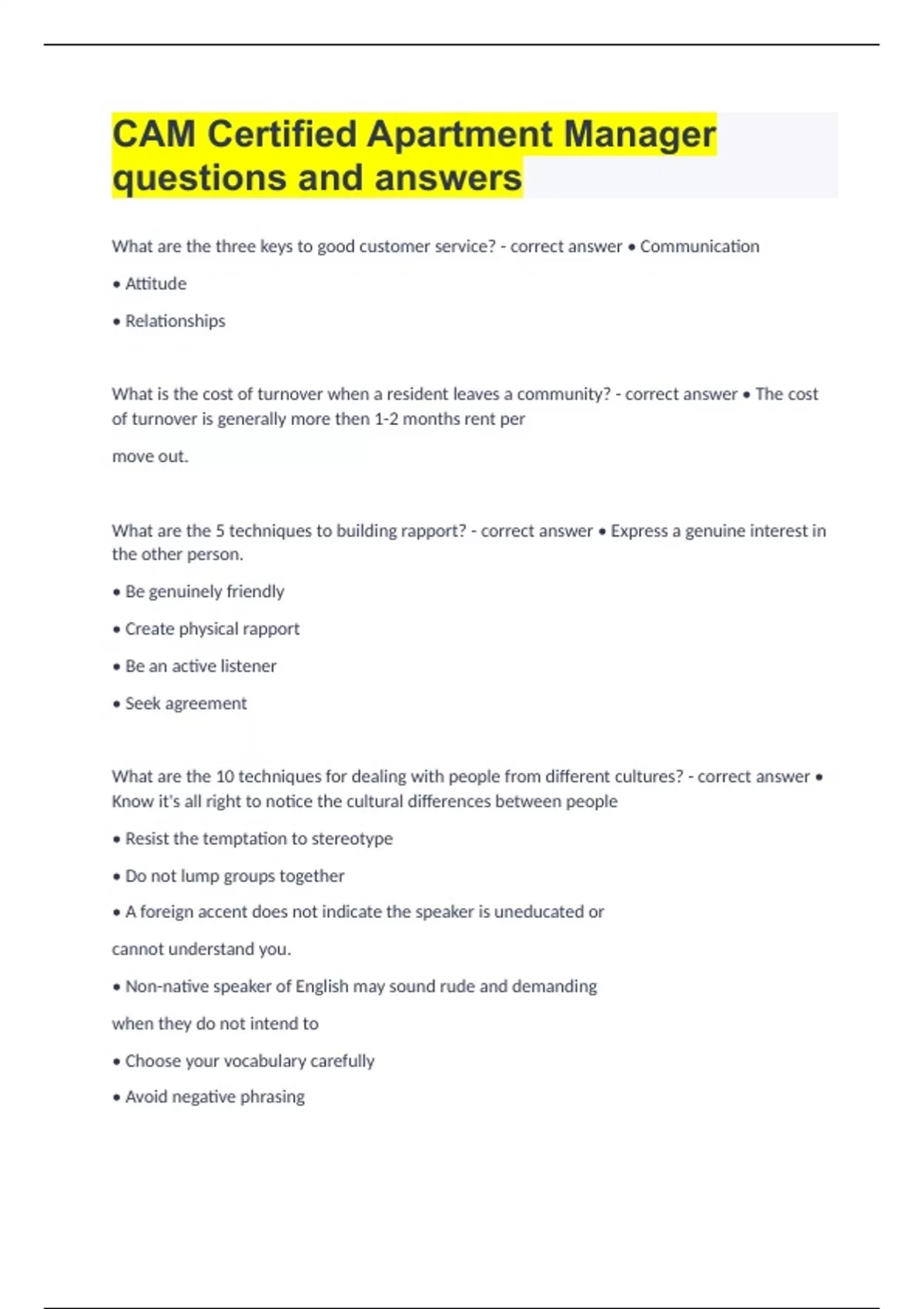 What are the three keys to good customer service? • Communication • Attitude • Relationships What is the cost of turnover when a resident leaves a community? • The cost of turnover is generally more then 1-2 months rent per move out. What are the 5 techniques to building rapport? • Express a genuine interest in the other person. • Be genuinely friendly • Create physical rapport • Be an active listener • Seek agreement What are the 10 techniques for dealing with people from different cultures? • Know it's all right to notice the cultural differences between people • Resist the temptation to stereotype • Do not lump groups together • A foreign accent does not indicate the speaker is uneducated or cannot understand you. • Non-native speaker of English may sound rude and demanding when they do not intend to • Choose your vocabulary carefully • Avoid negative phrasing • Watch for signs that you have not been understood • Participate in the communication process • Take time to build relationships slowly Explain the benefit of building relationships with residents. • Building relationships with residents' results in high occupancy rates. When residents feel connected to the community, they are less likely to move. Who should complete an application? • The application is completed by the prospective resident. Explain the effects of the Fair Credit Reporting Act (FCRA) and Fair and Accurate Credit Transaction Act (FACTA) on the applicant screening process. • FCRA protects the privacy and insures the accuracy of consumer report information and guarantees that the information supplied by consumer reporting agencies is as accurate as possible. • FACTA reauthorizes FCRA and addresses consumer concerns about identity theft and gives consumers the right to limit how businesses can use their non-public personal information. What are the three possible outcomes of the screening process and how is each handled? • Approved - send an approval letter, and notify the person by telephone. • Approved with conditions - send an approval letter explaining the conditions of the approval, and immediately telephone the person to explain the status of his or her application. • Denied - call the applicant to let him or her know the status of the application, and immediately send a denial letter that includes the contact information (name, address and phone number) for the credit reporting agency (CRA) that provided the adverse credit information. What are considered to be acceptable sources of documentation to use for income verification? • Most recent year's tax record • Three (3) most recent bank statements • Most recent pay stubs Define a lease A lease is a legally enforceable contract that grants a resident the rights and responsibilities of possession and use of an apartment for a specified period of time. It is often referred to as a rental agreement. What are the benefits of training the staff on taking service orders? • Studies have shown that service technicians waste up to 2 hours each day deciphering incomplete work orders. Completing service requests result in resident satisfaction and increase in Net Operating Income (NOI). What are some examples of emergency service requests and how should they be requested Examples of emergency service requests include: • no electricity • no plumbing or water throughout the apartment house • major water infiltration • no heat in temperatures below 55-60°F • no air conditioning in temperatures over 86-90°F • smoke alarms and/or Carbon Dioxide detectors sounding, and • apartment access problems such as broken Emergency service requests should be made by calling the office. Describe how to control access to keys. • Key systems should be un-mastered systems. • All keys should be locked in a key closet or key box that can only be accessed by designated employees. • Upon move-out all keys must be returned or a charge should be deducted from the security deposit. • Locks should be rekeyed prior to move-in. • Residents should complete a key release from which is retained in the resident's lease file. Without this written authorization, a key to an occupied unit should not be released. • All keys checked out should be noted on a Key Release log kept in the key closet or key box. Explain the steps a manager should take to respond to crime. • Contact the police (911) immediately • Provide as much information as possible • Go to the crime scene and wait for police to arrive • Determine whether the crime is serious and if the police need to call for emergency medical attention • If possible, have a staff member complete an incident report with the resident • Keep onlookers away from the scene • Determine the type of crime committed • Take notes of anyone tampering with the crime scene • Try to find witnesses • Cooperate with the police when they arrive • Inspect the residence for damage and repairs after the police have released control • Take photographs of all windows, doors and property damage • Suggest the resident make temporary living arrangements until damage can be repaired What are the three keys to ensuring residents pay their rent on time? • Be persistent • Be consistent • Be firm What are the acceptable methods of rent payment? • Personal checks • Money orders • Certified checks • Cashier checks What should be included in a move-out letter? • an explanation of any balances owed such as unpaid rent or late rent fees • specific cleaning requirements such as holes left from pictures, drapes, fleas from pets, etc. • a reminder that fixtures the resident has permanently attached to the wall must be left in place • final inspection details (how and when) • a request for forwarding address information, and • state law information that allows the owner to keep the deposit if the resident does not provide a forwarding address within a certain 