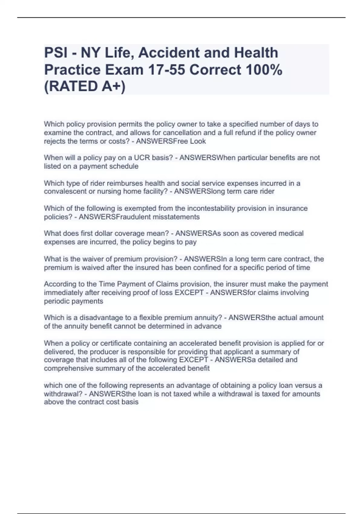 PSI - NY Life, Accident and Health Practice Exam 17-55 Correct 100%(RATED A+)