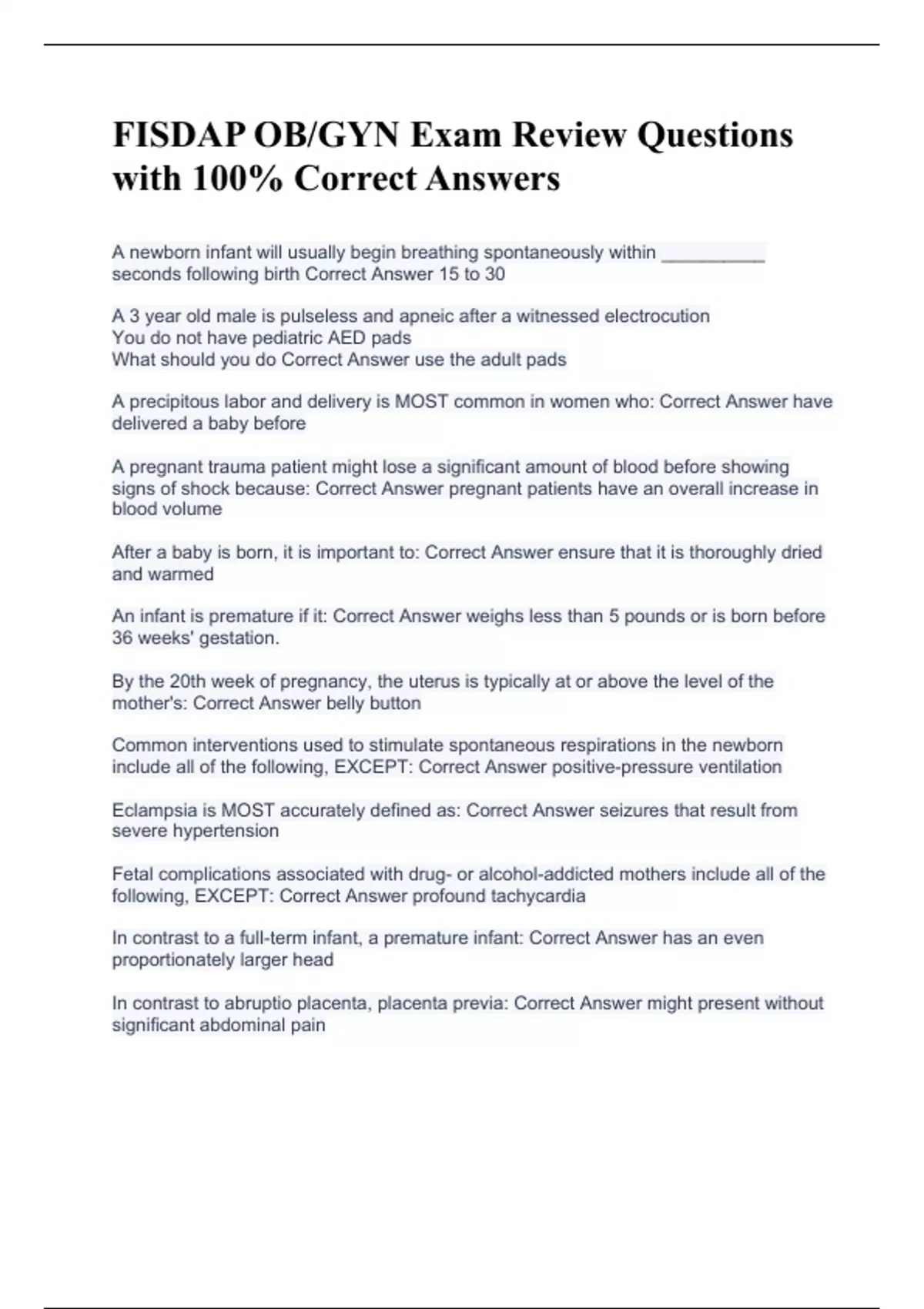 FISDAP OB/GYN Exam Review Questions with 100% Correct Answers