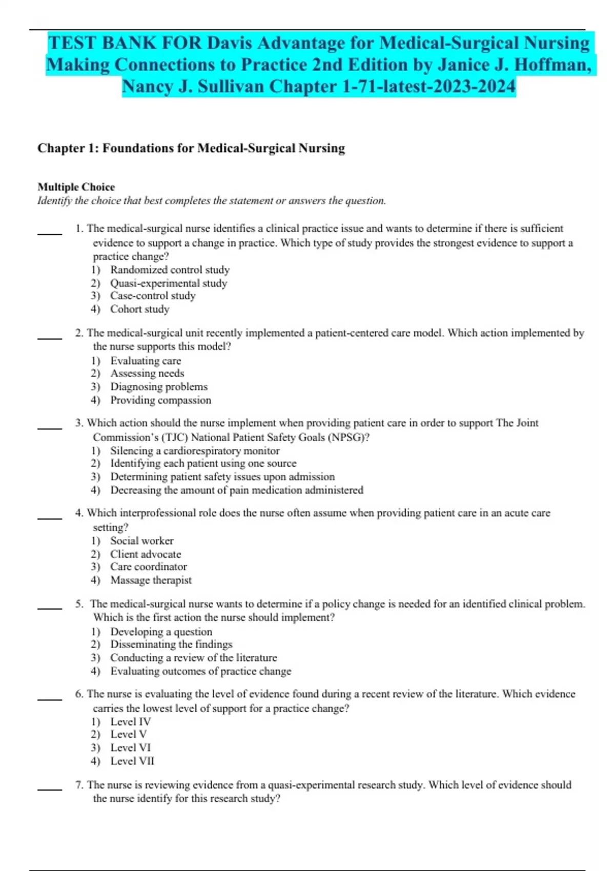 TEST BANK FOR Davis Advantage for Medical-Surgical Nursing Making Connections to Practice 2nd Edition by Janice J. Hoffman, Nancy J. Sullivan Chapter 1-71-latest-