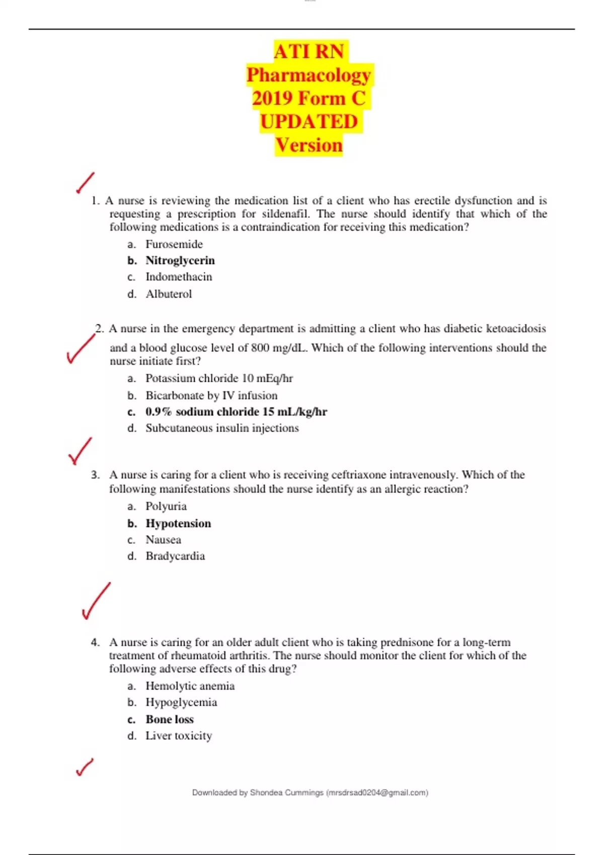 ATI RN Pharmacology 2019 Form C UPDATED Version 1. A nurse is reviewing the medication list of a client who has erectile dysfunction and is requesting a prescription for sildenafil. The nurse should identify that which of the following medications is a contraindication for receiving this medication? a. Furosemide b. Nitroglycerin c. Indomethacin d. Albuterol 2. A nurse in the emergency department is admitting a client who has diabetic ketoacidosis and a blood glucose level of 800 mg/dL. Which of the following interventions should the nurse initiate first? a. Potassium chloride 10 mEq/hr b. Bicarbonate by IV infusion c. 0.9% sodium chloride 15 mL/kg/hr d. Subcutaneous insulin injections 3. A nurse is caring for a client who is receiving ceftriaxone intravenously. Which of the following manifestations should the nurse identify as an allergic reaction? a. Polyuria b. Hypotension c. Nausea d. Bradycardia 4. A nurse is caring for an older adult client who is taking prednisone for a long-term treatment of rheumatoid arthritis. The nurse should monitor the client for which of the following adverse effects of this drug? a. Hemolytic anemia b. Hypoglycemia c. Bone loss d. Liver toxicity lOMoAR cPSD| Downloaded by Shondea Cummings () 5. A nurse is assessing a client who has asthma and prescription for albuterol. The nurse should monitor the client for which of the following adverse effects? lOMoAR cPSD| Downloaded by Shondea Cummings () a. Drowsiness b. Fever c. Constipation d. Tachycardia 6. A nurse is preparing to administer the initial dose of penicillin G IM to a client. The nurse should monitor for which of the following as an indication of an allergic reaction following the injection? a. Urticaria b. Bradycardia c. Pallor d. Dyspepsia 7. A nurse is mixing a regular insulin and NPH insulin in the same syringe prior to administering it to a client who has diabetes mellitus following actions should the nurse take first? a. Withdraw the regular insulin from the viral b. Withdraw a NPH insulin from the vial c. Inject air into the NPH vial d. Inject air into the regular insulin vial 8. A nurse is reviewing a client’s 0800 laboratory values at 1100. The nurse notes that the client received heparin at 1000. Which of the following laboratory values warrants an incident report? a. ePTT 90 seconds b. Hgb 16 g/dL c. INR 1.6 d. WBC 6,000/mm3 9. A nurse is performing a return demonstration of an enoxaparin administration. Which of the following client actions indicates an understanding of the teaching? a. Messages the site to enhance absorption b. Injections the medication into a muscle c. Administers the medication into the abdomen d. Aspirates the medication after injection