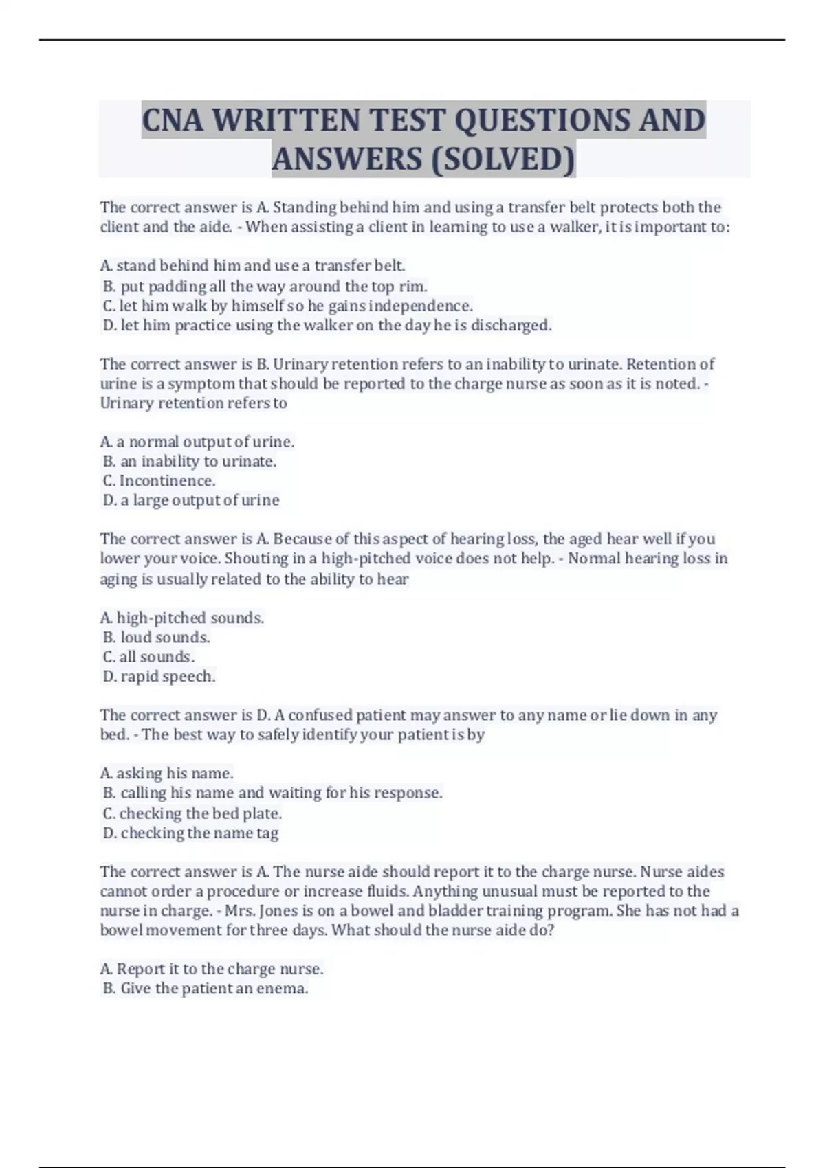 CNA WRITTEN TEST QUESTIONS AND ANSWERS (SOLVED)