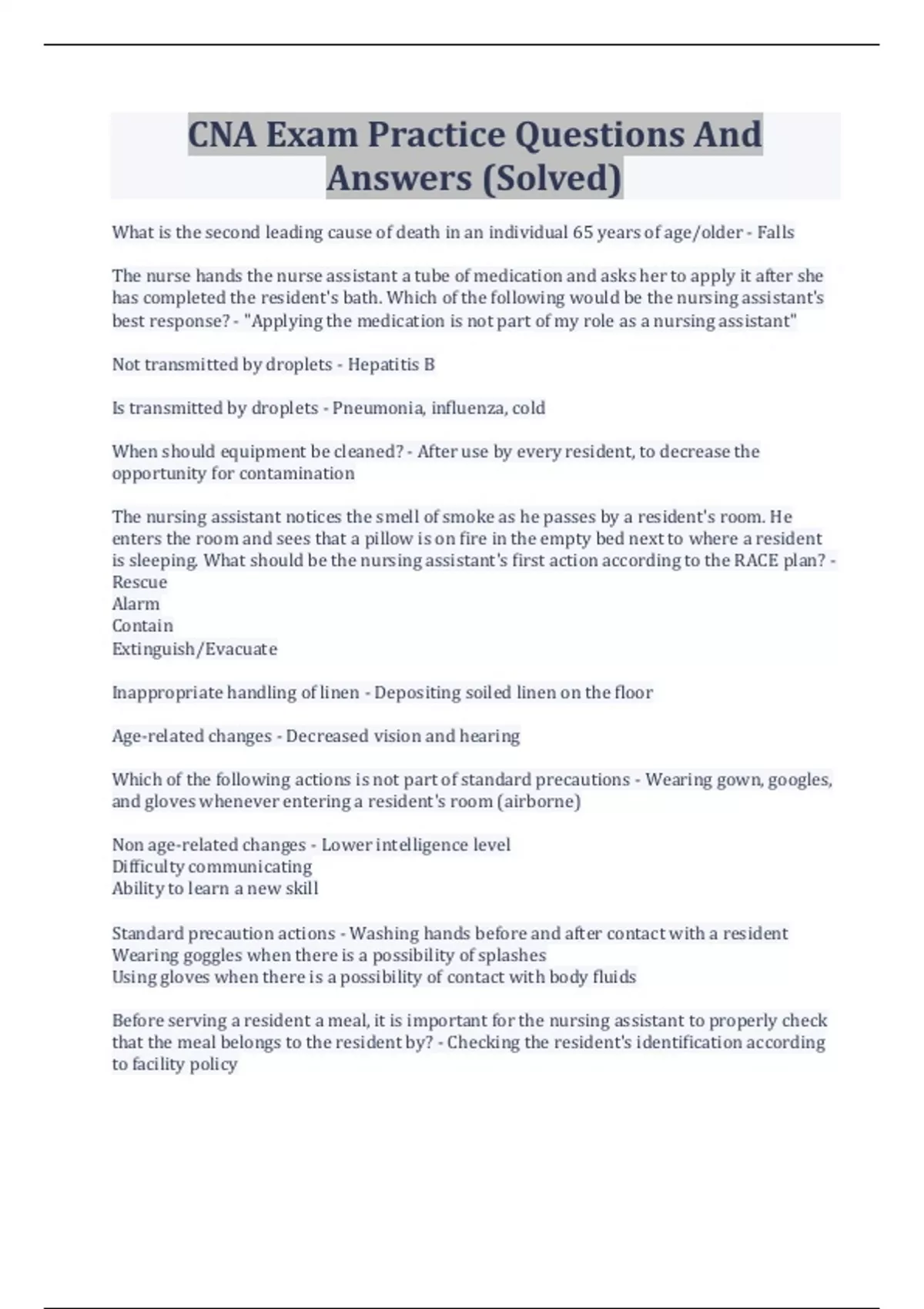 CNA Exam Practice Questions And Answers (Solved)