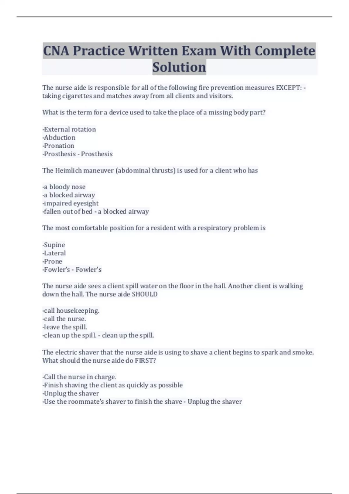 CNA Practice Written Exam With Complete Solution