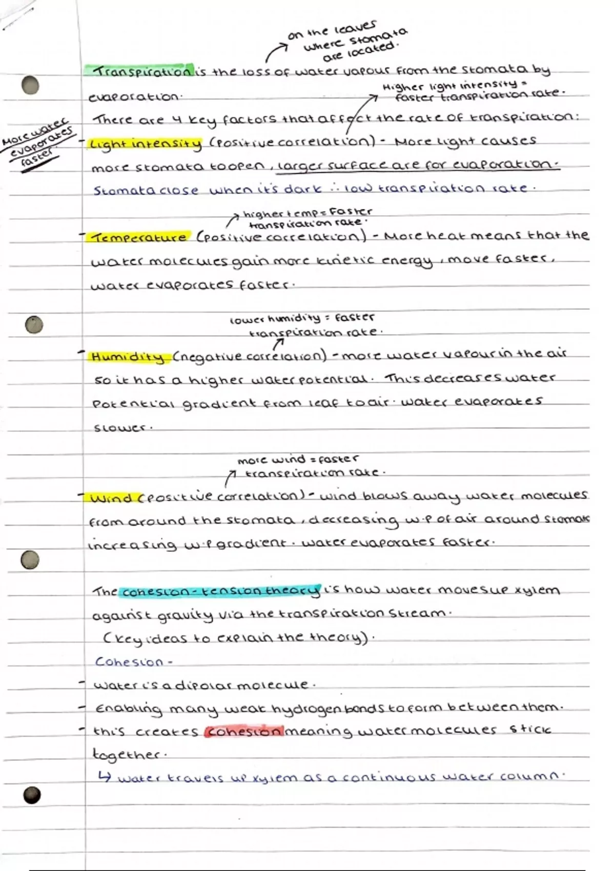 Handwritten notes on the following topics as part of the mass transport in plants section of unit 3: • Transpiration and factors affecting it • The cohesion-tension theory • Mass flow theory of translocation • Structure of phloem and xylem • Limiting water loss in plants • Investigating translocation Clearly written and easy to understand. Suitable for the AQA A-Level specification. Includes key marking points, scientific terminology and labelled pictures :)