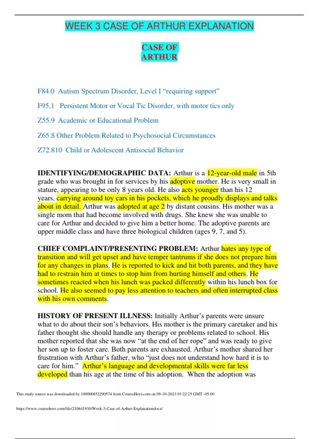F84.0 Autism Spectrum Disorder, Level I “requiring support” F95.1 Persistent Motor or Vocal Tic Disorder, with motor tics only Z55.9 Academic or Educational Problem Z65.8 Other Problem Related to Psychosocial Circumstances Z72.810 Child or Adolescent Antisocial Behavior IDENTIFYING/DEMOGRAPHIC DATA: Arthur is a 12-year-old male in 5th grade who was brought in for services by his adoptive mother. He is very small in stature, appearing to be only 8 years old. He also acts younger than his 12 years, carrying around toy cars in his pockets, which he proudly displays and talks about in detail. Arthur was adopted at age 2 by distant cousins. His mother was a single mom that had become involved with drugs. She knew she was unable to care for Arthur and decided to give him a better home. The adoptive parents are upper middle class and have three biological children (ages 9, 7, and 5). CHIEF COMPLAINT/PRESENTING PROBLEM: Arthur hates any type of transition and will get upset and have temper tantrums if she does not prepare him for any changes in plans. He is reported to kick and hit both parents, and they have had to restrain him at times to stop him from hurting himself and others. He sometimes reacted when his lunch was packed differently within his lunch box for school. He also seemed to pay less attention to teachers and often interrupted class with his own comments. HISTORY OF PRESENT ILLNESS: Initially Arthur’s parents were unsure what to do about their son’s behaviors. His mother is the primary caretaker and his father thought she should handle any therapy or problems related to school. His mother reported that she was now “at the end of her rope” and was ready to give her son up to foster care. Both parents are exhausted. Arthur’s mother shared her frustration with Arthur’s father, who “just does not understand how hard it is to care for him.” Arthur’s language and developmental skills were far less developed than his age at the time of his adoption. When the adoption was completed and they brought him home, Arthur cried often and refused to sleep for the first 2 days they had him. They tried holding him, but he would not quiet down. Arthur is reported to often get upset with his siblings and hit or kick them. His mother stated that Arthur has always had issues with jealousy, and when her other children were younger, she had to closely monitor him when he was around them. She reported several occasions when she found Arthur attempting to suffocate each of his younger siblings when they were babies. Arthur’s mother explained this as part of his “always being immature” and not good at explaining himself. Besides this, his mother reported that he is not a “mean” child but tends to function according to his own rules. He often needed reminders to use his “indoor voice” and to “wait his turn to speak.” The mother reported that Arthur often hides food in his room and gorges himself when he eats. She said she does not understand this behavior because he always has enough food, and she never restricts his eating. In fact, because of his small size and weight, she often encourages him to eat more. The parents have never sought help before, as Arthur managed to largely keep up with his schoolwork. He does have an aide in the classroom to help with his work and behavior. His mother said that he has always taken things literally, but up until 5th grade, he had attended school without major problems. They had not been concerned about his grades or lack of friends. His mother said that he has always been “very shy” and never had a “best friend.” He has always shown interest in cars, trains, and trucks. Recently, behaviors at school changed and worsened. His school has complained of his inability to focus and the increase in his disruptive behaviors. Collateral contact with his teachers confirmed that he struggles with school, has no friends, and often has “meltdowns” when he does not get his way. One teacher noted that in small group classroom activities, Arthur has trouble with restlessness and will stumble over his words, pause excessively, and restart talking fairly rapidly and loudly. His teachers noted a concern about occasional facial “tics” that occurred at times. His teachers commented that he talks a lot about details of World War II at times in school. PAST PSYCHIATRIC HISTORY: Arthur had never had any official testing for special education, nor had he ever received any counseling services. Since up to know he was able to keep up with his school work with the help of the aide.