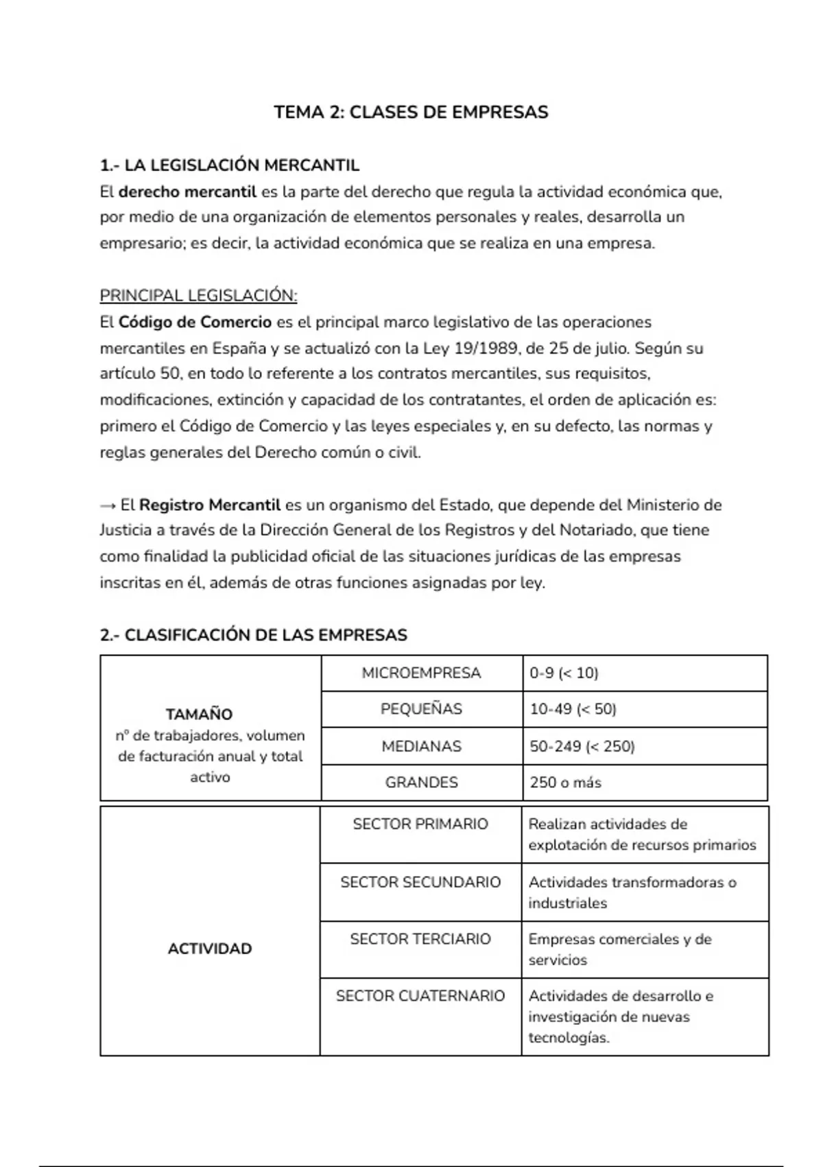Sumario ECONOMÍA TEMA 2 CLASES DE EMPRESA