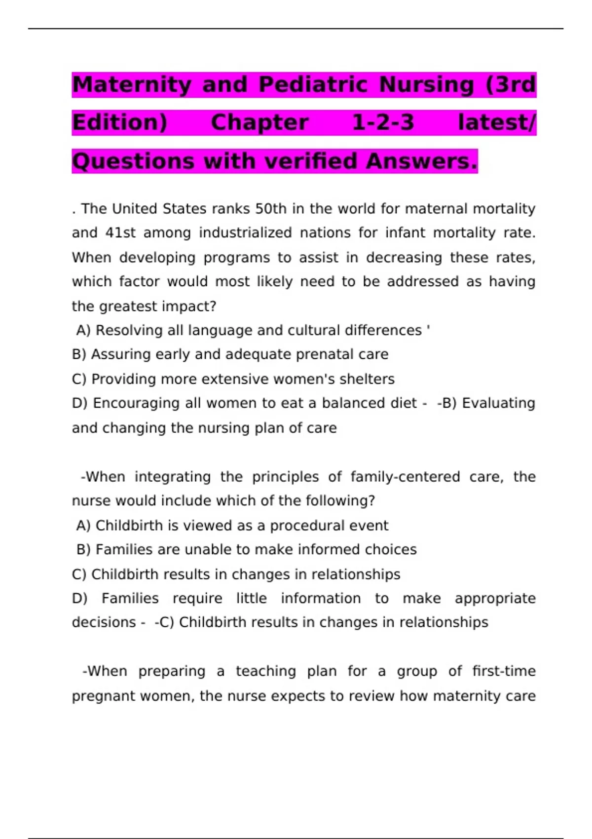 Maternity and Pediatric Nursing (3rd Edition) Chapter 1-2-3 latest/ Questions with verified Answers.