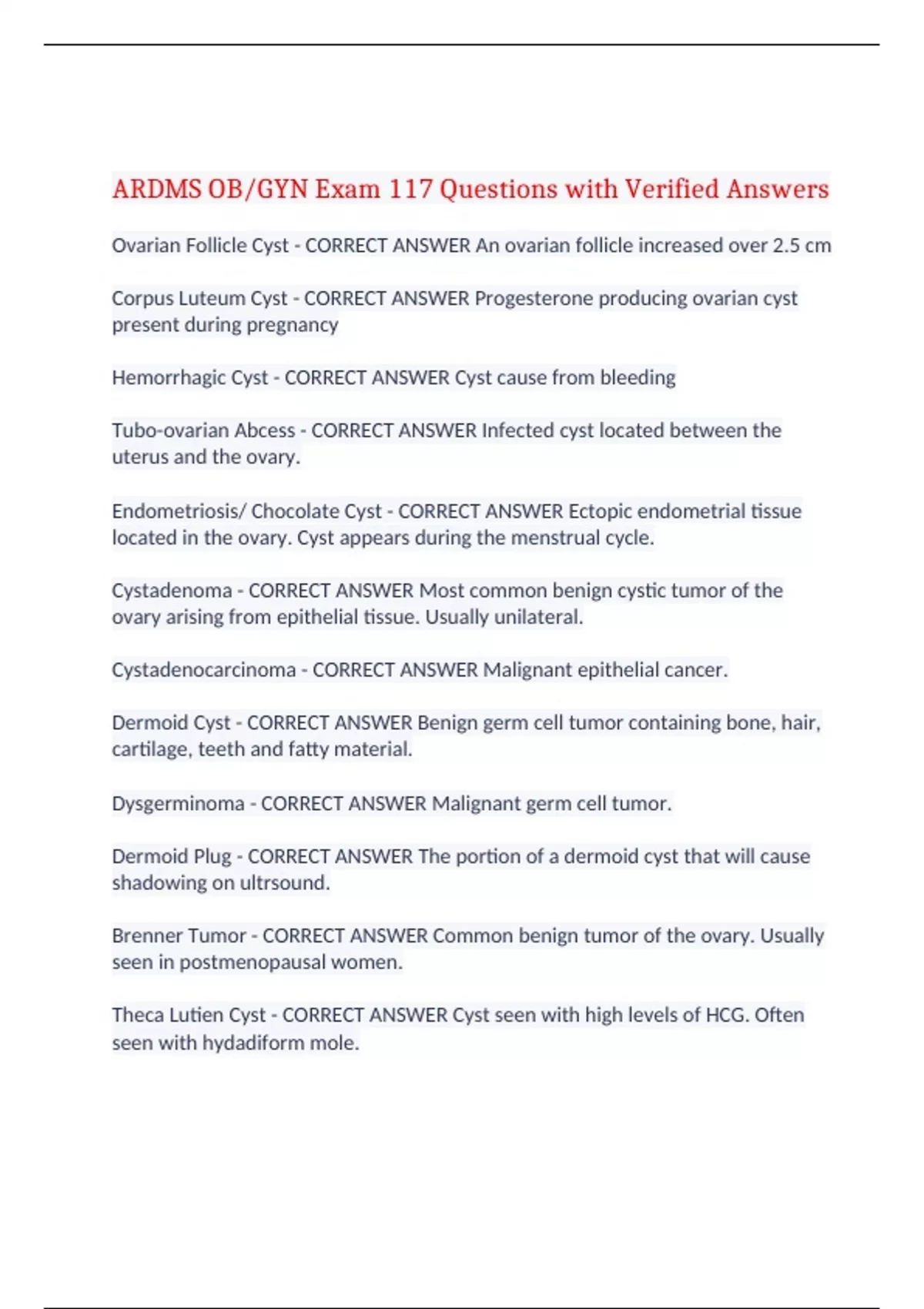ARDMS OB/GYN Exam 117 Questions with Verified Answers Ovarian Follicle Cyst - CORRECT ANSWER An ovarian follicle increased over 2.5 cm Corpus Luteum Cyst - CORRECT ANSWER Progesterone producing ovarian cyst present during pregnancy Hemorrhagic Cyst - CORRECT ANSWER Cyst cause from bleeding Tubo-ovarian Abcess - CORRECT ANSWER Infected cyst located between the uterus and the ovary. Endometriosis/ Chocolate Cyst - CORRECT ANSWER Ectopic endometrial tissue located in the ovary. Cyst appears during the menstrual cycle. Cystadenoma - CORRECT ANSWER Most common benign cystic tumor of the ovary arising from epithelial tissue. Usually unilateral. Cystadenocarcinoma - CORRECT ANSWER Malignant epithelial cancer. Dermoid Cyst - CORRECT ANSWER Benign germ cell tumor containing bone, hair, cartilage, teeth and fatty material. Dysgerminoma - CORRECT ANSWER Malignant germ cell tumor. Dermoid Plug - CORRECT ANSWER The portion of a dermoid cyst that will cause shadowing on ultrsound. Brenner Tumor - CORRECT ANSWER Common benign tumor of the ovary. Usually seen in postmenopausal women. Theca Lutien Cyst - CORRECT ANSWER Cyst seen with high levels of HCG. Often seen with hydadiform mole. Ovarian Torsion - CORRECT ANSWER Complete or partial rotation of the ovarian pedicle on its axis. The right ovary is three times more likely to torse than the left. Ectopic Pregnancy - CORRECT ANSWER Gestational sac located anywhere outside of the fundus of the uterus. Heterotopic Pregnancy - CORRECT ANSWER Intrauterine pregnancy and correlating ectopic pregnancy in the same patient. Polycystic Ovarian Disease - CORRECT ANSWER Ovarian disease characterized by anovulation due to an endocrine imbalance. Stein-Leventhal Syndrome - CORRECT ANSWER Another name for polycystic ovarian disease. Hyperstimulated Ovaries - CORRECT ANSWER Overstimulated follicles increased in size due to infertility treatments. Thecoma - CORRECT ANSWER Benign ovarian tumor usually seen in postmenopausal women. Produces estrogen. Fibroma - CORRECT ANSWER Benign ovarian tumor comprised of muscle. Sertoli-Leydig Cell Tumor - CORRECT ANSWER An androgen producing ovarian tumor that causes masculinization. Granulosa Tumor - CORRECT ANSWER Estrogen producing ovarian tumor. Krukenberg Tumor - CORRECT ANSWER Malignant tumor of the ovary that metastasized from the GI tract such as the stomach or colon. Fibromyoma - CORRECT ANSWER Uterine mass made of muscle. Adenomyosis - CORRECT ANSWER Ectopic endometrial tissue within the myoma. Causes enlargement of the uterus with abnormal contours. Uterine Polyps - CORRECT ANSWER Overgrowth of uterine tissue into the endometrial cavity. Endometritis - CORRECT ANSWER Infection of the endometrium seen after sexually transmitted disease. T-shaped Uterus - CORRECT ANSWER T-shaped endometrium. Associated with the use of DES medication for infertility. Uterine Adenocarcinoma - CORRECT ANSWER Uterine cancer usually seen in postmenopausal women. Causes abnormal bleeding. Threatened Abortion - CORRECT ANSWER First trimester bleeding with a closed cervix and normal GS position. Incomplete Abortion - CORRECT ANSWER Miscarriage with either fetal or placental components left behind. Complete Abortion - CORRECT ANSWER Full expostulation of fetus and placenta from the uterus before term. Septic Abortion - CORRECT ANSWER Miscarriage with either fetal or placental components left behind that causes infection in the mother. Inevitable Abortion - CORRECT ANSWER In the first trimester when the GS is seen to move close to the cervix and the cervix dilates. Incompetent Cervix - CORRECT ANSWER Cervix dilates too early for delivery. Measures less that 3cm in length. Placenta Previa - CORRECT ANSWER When the placenta grows so that it covers the cervix. Circumvallate Placenta - CORRECT ANSWER The placenta doubles back causing a ring-like shape. Hydatidiform Mole Placenta - CORRECT ANSWER Overgrowth of placental tissue that forms a mass. Placenta Hydrops - CORRECT ANSWER Enlarged placental thickness >4cm with cystic changes. Usually seen with hydrops fetalis. Abruptio Placentae - CORRECT ANSWER Abnormal detachment of the placenta from the uterine wall. Choriogangioangioma - CORRECT ANSWER Tumor made up of blood vessels. Trophoblastic Disease - CORRECT ANSWER Another name for molar pregnancy. 2 Vessels Cord - CORRECT ANSWER Umbilical cord containing only one artery. Associated with trisomy 18 and 21. Cord Previa - CORRECT ANSWER Umbilical cord covering the cervical os. Cord Prolapse - CORRECT ANSWER Umbilical cord presents first during delivery and is seen within the cervix. Nuchal Cord - CORRECT ANSWER More than one umbilical cord loop around the fetal neck. Velamentous Cord Insertion - CORRECT ANSWER Umbilical cord inserts into the side of the placenta. Choriod Plexus Cyst - CORRECT ANSWER Normal cyst in the choriod plexus until the 26th week. Encephalocele - CORRECT ANSWER Bony defect in the skull with the brain tissue protruding. Agenesis of Corpus Callosum - CORRECT ANSWER Dilation of the posterior horns of the lateral ventricles (tear drop). Upward displacement of the CSP and the 3rd ventricle. Hydrocephalus - CORRECT ANSWER Excess fluid in the lateral ventricles measuring greater than 10 mm. Dangling choriod plexus. Hydraencephaly - CORRECT ANSWER Excess fluid fills the head. Falx is absent or incomplete. Cystic Hygroma - CORRECT ANSWER Bilateral cysts at the back of the head. Seen with turners syndrome. Only present in females. Arnold Chiari Type II Malformation - CORRECT ANSWER Group of cranial abnormalities associated with spina bifida. Absent cisterna magna, banana sign, and lemon sign. Micrognathia - CORRECT ANSWER Small chin. Hyperglossia - CORRECT ANSWER Large tongue. Anencephaly - CORRECT ANSWER Absence of a large part of the brain or skull. Holoprosencephaly - CORRECT ANSWER Failure of the forebrain to divide into hemispheres. Semilobar Holoprosencephaly - CORRECT ANSWER A partial fissure between two hemispheres of the brain. Associat