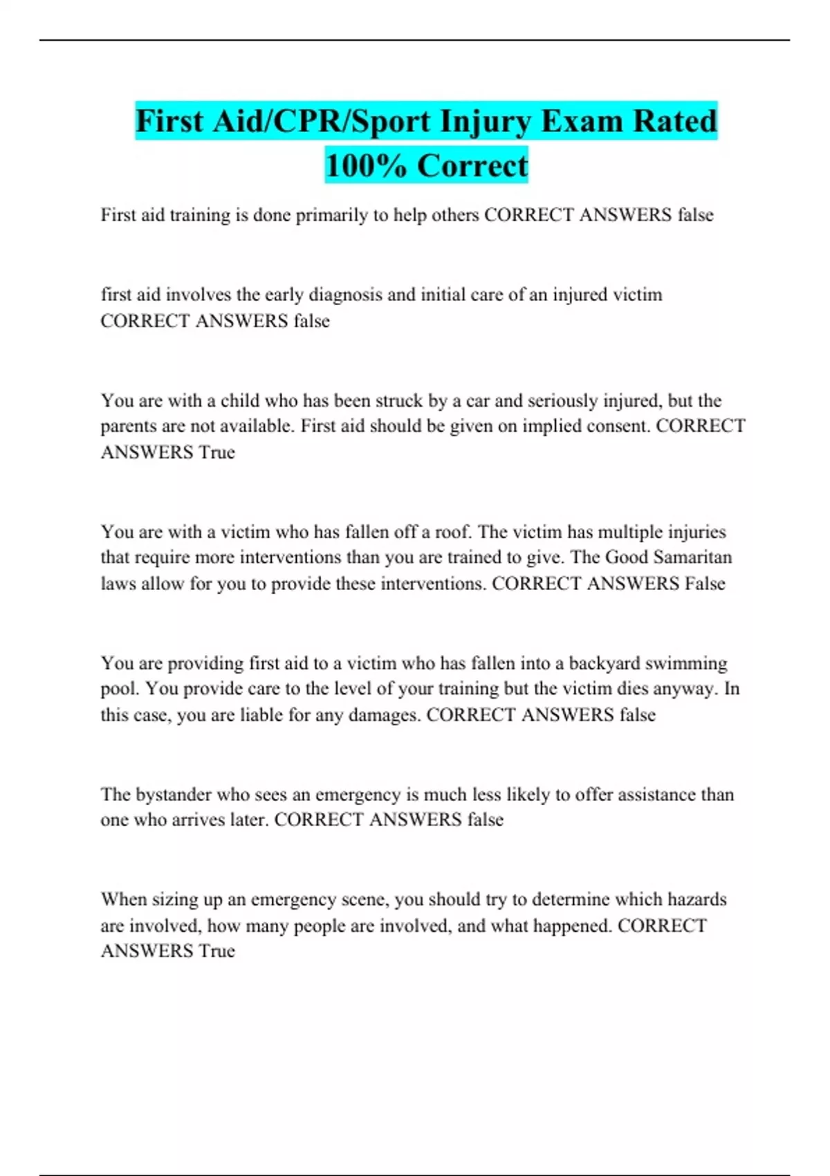 First Aid/CPR/Sport Injury Exam Rated 100% Correct