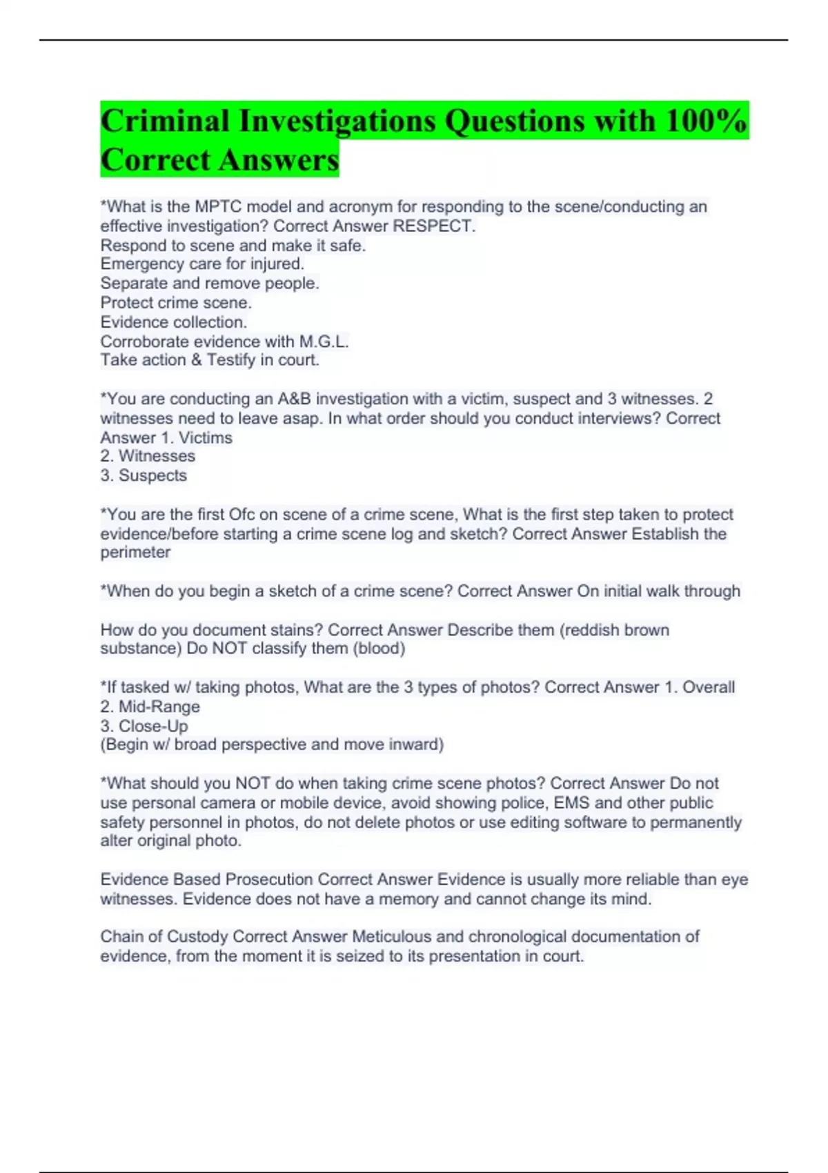 What is the MPTC model and acronym for responding to the scene/conducting an effective investigation? Correct Answer RESPECT. Respond to scene and make it safe. Emergency care for injured. Separate and remove people. Protect crime scene. Evidence collection. Corroborate evidence with M.G.L. Take action & Testify in court. *You are conducting an A&B investigation with a victim, suspect and 3 witnesses. 2 witnesses need to leave asap. In what order should you conduct interviews? Correct Answer 1. Victims 2. Witnesses 3. Suspects *You are the first Ofc on scene of a crime scene, What is the first step taken to protect evidence/before starting a crime scene log and sketch? Correct Answer Establish the perimeter *When do you begin a sketch of a crime scene? Correct Answer On initial walk through How do you document stains? Correct Answer Describe them (reddish brown substance) Do NOT classify them (blood) *If tasked w/ taking photos, What are the 3 types of photos? Correct Answer 1. Overall 2. Mid-Range 3. Close-Up (Begin w/ broad perspective and move inward) *What should you NOT do when taking crime scene photos? Correct Answer Do not use personal camera or mobile device, avoid showing police, EMS and other public safety personnel in photos, do not delete photos or use editing software to permanently alter original photo. Evidence Based Prosecution Correct Answer Evidence is usually more reliable than eye witnesses. Evidence does not have a memory and cannot change its mind. Chain of Custody Correct Answer