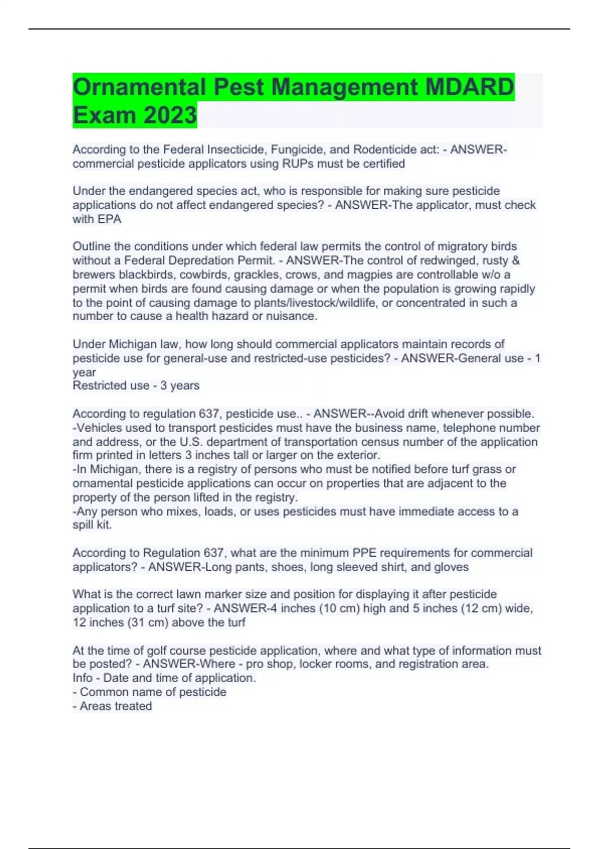 According to the Federal Insecticide, Fungicide, and Rodenticide act: - ANSWER-commercial pesticide applicators using RUPs must be certified Under the endangered species act, who is responsible for making sure pesticide applications do not affect endangered species? - ANSWER-The applicator, must check with EPA Outline the conditions under which federal law permits the control of migratory birds without a Federal Depredation Permit. - ANSWER-The control of redwinged, rusty & brewers blackbirds, cowbirds, grackles, crows, and magpies are controllable w/o a permit when birds are found causing damage or when the population is growing rapidly to the point of causing damage to plants/livestock/wildlife, or concentrated in such a number to cause a health hazard or nuisance. Under Michigan law, how long should commercial applicators maintain records of pesticide use for general-use and restricted-use pesticides? - ANSWER-General use - 1 year Restricted use - 3 years According to regulation 637, pesticide use.. - ANSWER--Avoid drift whenever possible. -Vehicles used to transport pesticides must have the business name, telephone number and address, or the U.S. department of transportation census number of the application firm printed in letters 3 inches tall or larger on the exterior. -In Michigan, there is a registry of persons who must be notified before turf grass or ornamental pesticide applications can occur on properties that are adjacent to the property of the person lifted in the registry. -Any person who mixes, loads, or uses pesticides must have immediate access to a spill kit. According to Regulation 637, what are the minimum PPE requirements for commercial applicators? - ANSWER-Long pants, shoes, long sleeved shirt, and gloves What is the correct lawn marker size and position for displaying it after pesticide application to a turf site? - ANSWER-4 inches (10 cm) high and 5 inches (12 cm) wide, 12 inches (31 cm) above the turf At the time of golf course pesticide application, where and what type of information must be posted? - ANSWER-Where - pro shop, locker rooms, and registration area. Info - Date and time of application. - Common name of pesticide - Areas treated