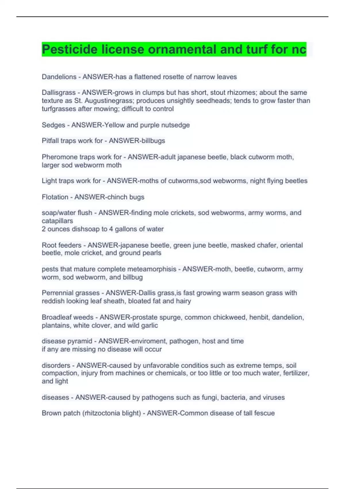 Dandelions - ANSWER-has a flattened rosette of narrow leaves Dallisgrass - ANSWER-grows in clumps but has short, stout rhizomes; about the same texture as St. Augustinegrass; produces unsightly seedheads; tends to grow faster than turfgrasses after mowing; difficult to control Sedges - ANSWER-Yellow and purple nutsedge Pitfall traps work for - ANSWER-billbugs Pheromone traps work for - ANSWER-adult japanese beetle, black cutworm moth, larger sod webworm moth Light traps work for - ANSWER-moths of cutworms,sod webworms, night flying beetles Flotation - ANSWER-chinch bugs soap/water flush - ANSWER-finding mole crickets, sod webworms, army worms, and catapillars 2 ounces dishsoap to 4 gallons of water Root feeders - ANSWER-japanese beetle, green june beetle, masked chafer, oriental beetle, mole cricket, and ground pearls pests that mature complete meteamorphisis - ANSWER-moth, beetle, cutworm, army worm, sod webworm, and billbug Perrennial grasses - ANSWER-Dallis grass,is fast growing warm season grass with reddish looking leaf sheath, bloated fat and hairy Broadleaf weeds - ANSWER-prostate spurge, common chickweed, henbit, dandelion, plantains, white clover, and wild garlic disease pyramid - ANSWER-enviroment, pathogen, host and time if any are missing no disease will occur disorders - ANSWER-caused by unfavorable conditios such as extreme temps, soil compaction, injury from machines or chemicals, or too little or too much water, fertilizer, and light diseases - ANSWER-caused by pathogens such as fungi, bacteria, and viruses Brown patch (rhitzoctonia blight) - ANSWER-Common disease of tall fescue