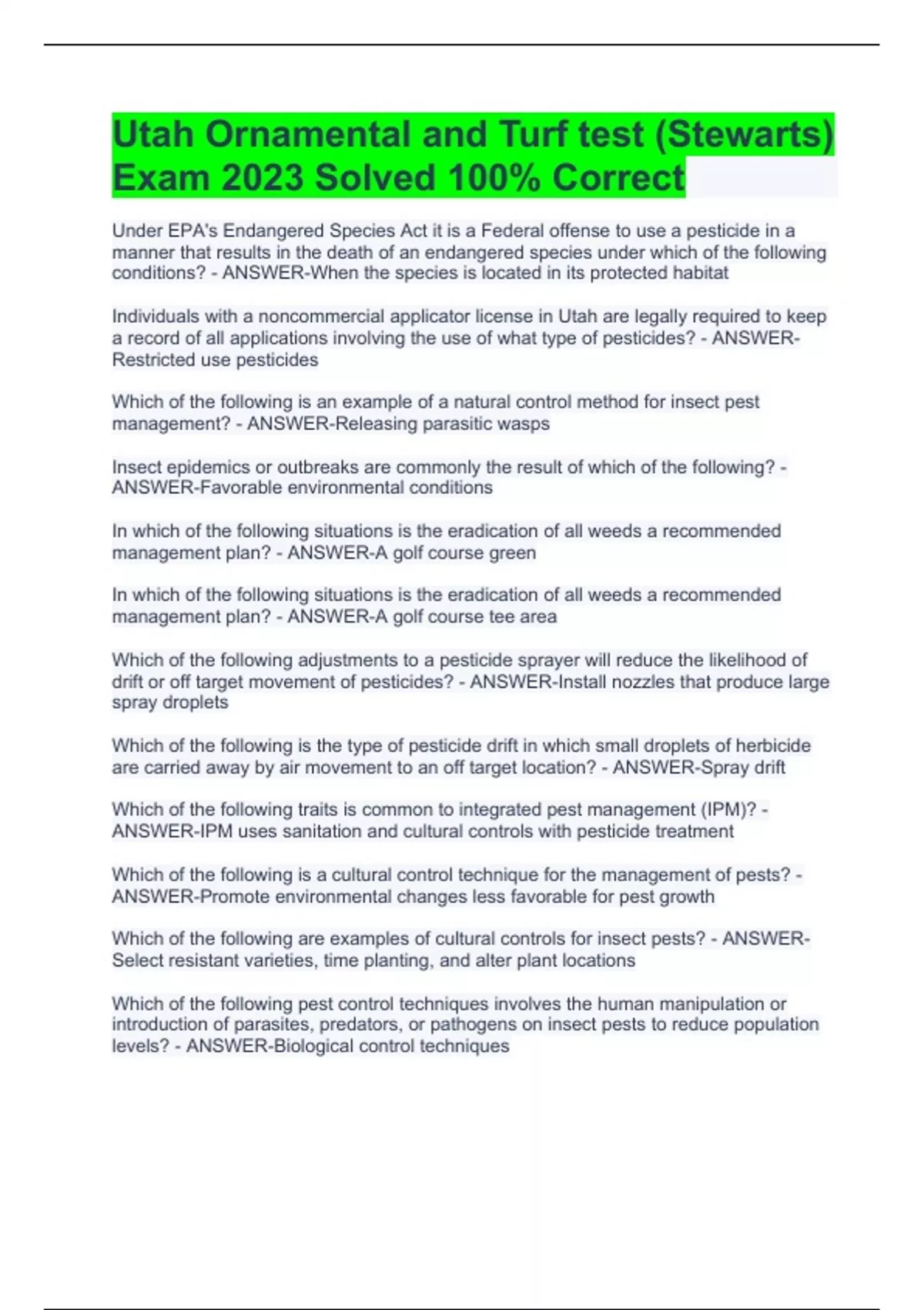 Under EPA's Endangered Species Act it is a Federal offense to use a pesticide in a manner that results in the death of an endangered species under which of the following conditions? - ANSWER-When the species is located in its protected habitat Individuals with a noncommercial applicator license in Utah are legally required to keep a record of all applications involving the use of what type of pesticides? - ANSWER-Restricted use pesticides Which of the following is an example of a natural control method for insect pest management? - ANSWER-Releasing parasitic wasps Insect epidemics or outbreaks are commonly the result of which of the following? - ANSWER-Favorable environmental conditions In which of the following situations is the eradication of all weeds a recommended management plan? - ANSWER-A golf course green In which of the following situations is the eradication of all weeds a recommended management plan? - ANSWER-A golf course tee area Which of the following adjustments to a pesticide sprayer will reduce the likelihood of drift or off target movement of pesticides? - ANSWER-Install nozzles that produce large spray droplets Which of the following is the type of pesticide drift in which small droplets of herbicide are carried away by air movement to an off target location? - ANSWER-Spray drift Which of the following traits is common to integrated pest management (IPM)? - ANSWER-IPM uses sanitation and cultural controls with pesticide treatment Which of the following is a cultural control technique for the management of pests? - ANSWER-Promote environmental changes less favorable for pest growth Which of the following are examples of cultural controls for insect pests? - ANSWER-Select resistant varieties, time planting, and alter plant locations Which of the following pest control techniques involves the human manipulation or introduction of parasites, predators, or pathogens on insect pests to reduce population levels? - ANSWER-Biological control techniques